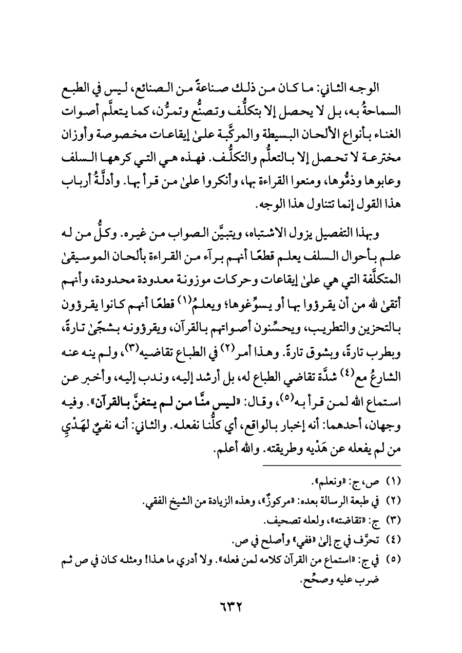 الوجه الثاني: ما كان من ذلك صناعةً من الصنائع، ليس في الطبع السماحةُ به، بل لا يحصل إلا بتكلُّف وتصنُّع وتمرُّن، كما يتعلَّم أصوات الغناء بأنواع الألحان البسيطة والمركَّبة على إيقاعات مخصوصة وأوزان مخترعة لا تحصل إلا بالتعلُّم والتكلُّف. فهذه هي التي كرهها السلف وعابوها وذمُّوها، ومنعوا القراءة بها، وأنكروا على من قرأ بها. وأدلَّةُ أرباب هذا القول إنما تتناول هذا الوجه.