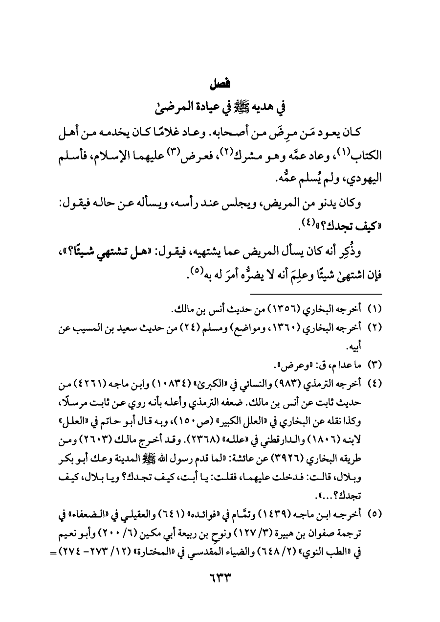 كان يعود مَن مرِضَ من أصحابه. وعاد غلامًا كان يخدمه من أهل الكتاب (¬١)، وعاد عمَّه وهو مشرك (¬٢)، فعرض (¬٣) عليهما الإسلام، فأسلم اليهودي، ولم يُسلم عمُّه.