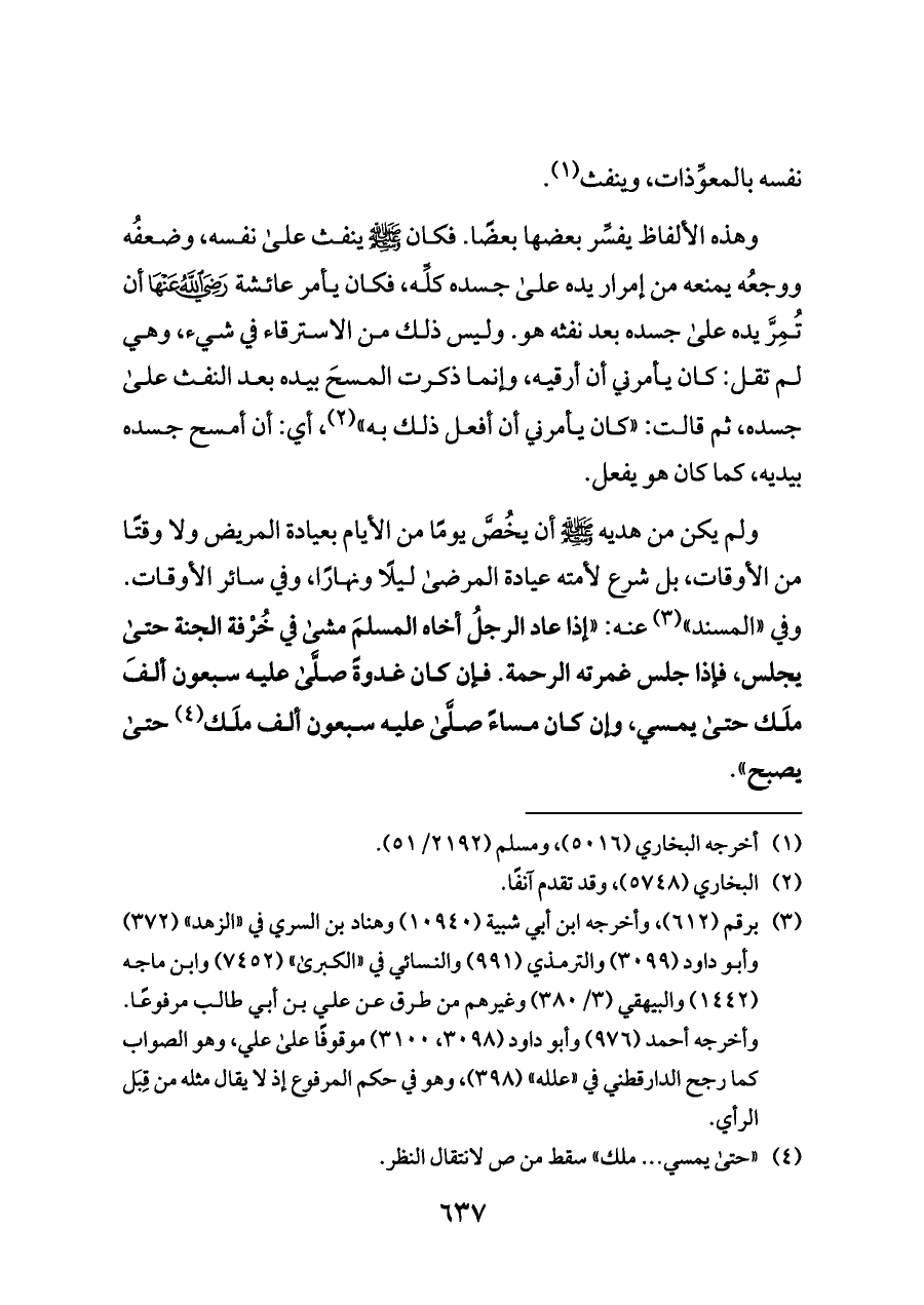 وهذه الألفاظ يفسِّر بعضها بعضًا. فكان - صلى الله عليه وسلم - ينفث على نفسه، وضعفُه ووجعُه يمنعه من إمرار يده على جسده كلِّه، فكان يأمر عائشة - رضي الله عنها - أن تُمِرَّ يده على جسده بعد نفثه هو. وليس ذلك من الاسترقاء في شيء، وهي لم تقل: كان يأمرني أن أرقيه، وإنما ذكرت المسحَ بيده بعد النفث على جسده، ثم قالت: «كان يأمرني أن أفعل ذلك به» (¬٢)، أي: أن أمسح جسده بيديه، كما كان هو يفعل.