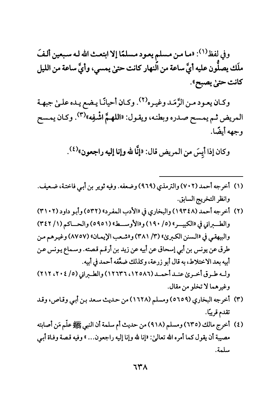 (¬٤) أخرج مالك (٦٣٥) ومسلم (٩١٨) من حديث أم سلمة أن النبي - صلى الله عليه وسلم - علّم مَن أصابته مصيبة أن يقول كما أمره الله تعالى: «إنا لله وإنا إليه راجعون ... » وفيه قصة وفاة أبي سلمة.
