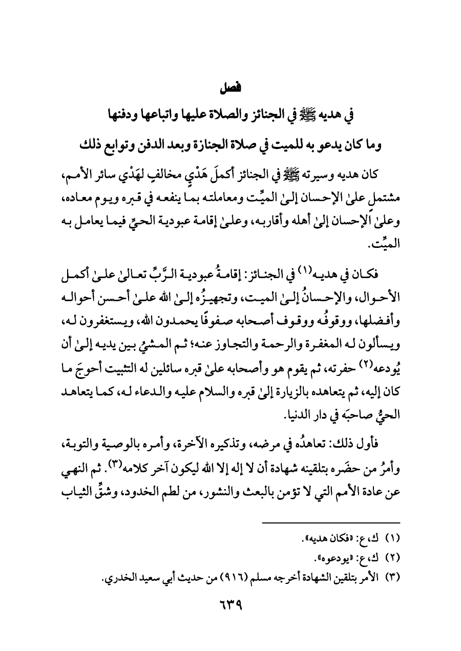 فأول ذلك: تعاهدُه في مرضه، وتذكيره الآخرة، وأمره بالوصية والتوبة، وأمرُ من حضَره بتلقينه شهادة أن لا إله إلا الله ليكون آخر كلامه (¬٣). ثم النهي عن عادة الأمم التي لا تؤمن بالبعث والنشور، من لطم الخدود، وشقِّ الثياب