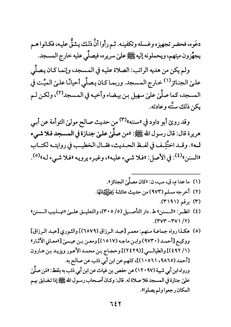 وقد روى أبو داود في «سننه» (¬٣) من حديث صالح مولى التوأمة عن أبي هريرة قال: قال رسول الله - صلى الله عليه وسلم -: «من صلَّى على جنازة في المسجد فلا شيء له». وقد اختُلِف في لفظ الحديث، فقال الخطيب في روايته لكتاب «السنن» (¬٤): في الأصل: «فلا شيء عليه»، وغيره يرويه «فلا شيء له» (¬٥).