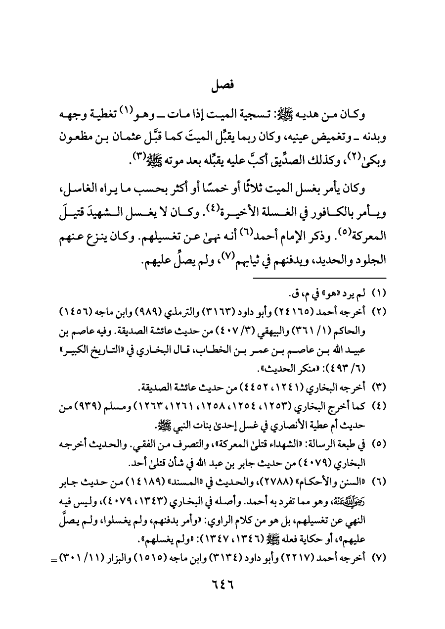 (¬٦) «السنن والأحكام» (٢٧٨٨)، والحديث في «المسند» (١٤١٨٩) من حديث جابر - رضي الله عنه -، وهو مما تفرد به أحمد. وأصله في البخاري (١٣٤٣، ٤٠٧٩)، وليس فيه النهي عن تغسيلهم، بل هو من كلام الراوي: «وأمر بدفنهم، ولم يغسلوا، ولم يصلَّ عليهم»، أو حكاية فعله - صلى الله عليه وسلم - (١٣٤٦، ١٣٤٧): «ولم يغسلهم».