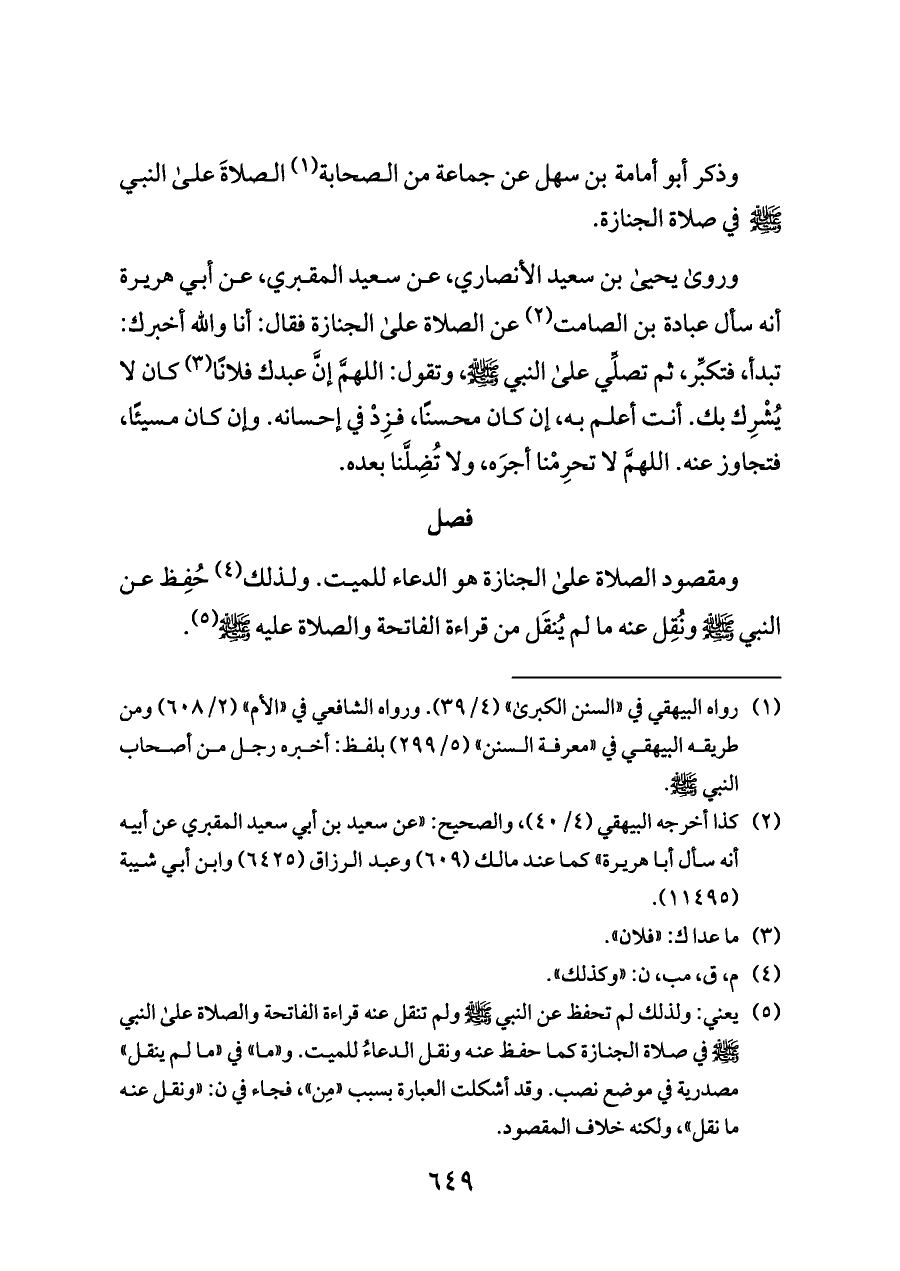 (¬٥) يعني: ولذلك لم تحفظ عن النبي - صلى الله عليه وسلم - ولم تنقل عنه قراءة الفاتحة والصلاة على النبي - صلى الله عليه وسلم - في صلاة الجنازة كما حفظ عنه ونقل الدعاءُ للميت. و «ما» في «ما لم ينقل» مصدرية في موضع نصب. وقد أشكلت العبارة بسبب «مِن»، فجاء في ن: «ونقل عنه ما نقل»، ولكنه خلاف المقصود.