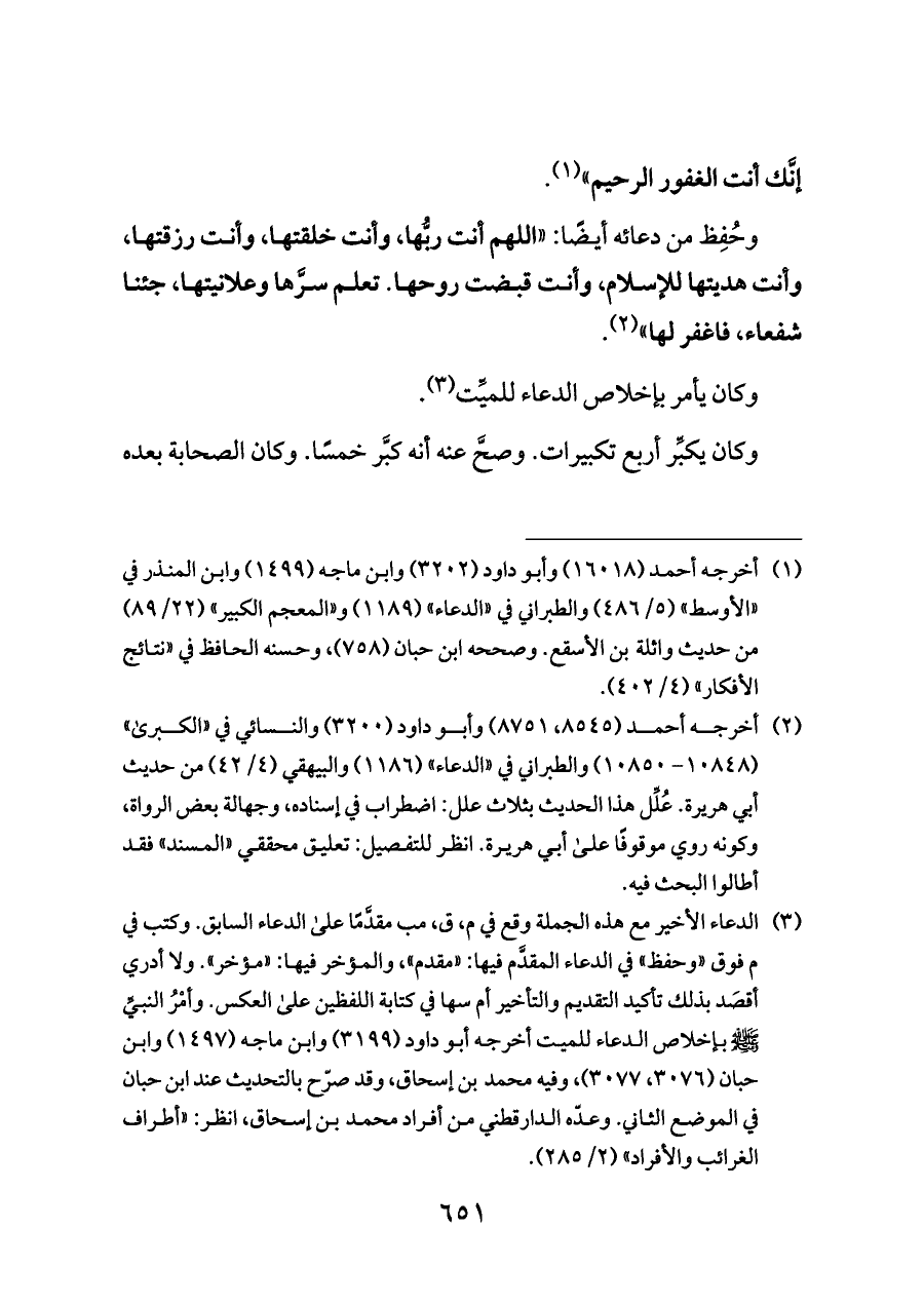 (¬٣) الدعاء الأخير مع هذه الجملة وقع في م، ق، مب مقدَّمًا على الدعاء السابق. وكتب في م فوق «وحفظ» في الدعاء المقدَّم فيها: «مقدم»، والمؤخر فيها: «مؤخر». ولا أدري أقصَد بذلك تأكيد التقديم والتأخير أم سها في كتابة اللفظين على العكس. وأمْرُ النبيِّ - صلى الله عليه وسلم - بإخلاص الدعاء للميت أخرجه أبو داود (٣١٩٩) وابن ماجه (١٤٩٧) وابن حبان (٣٠٧٦، ٣٠٧٧)، وفيه محمد بن إسحاق، وقد صرّح بالتحديث عند ابن حبان في الموضع الثاني. وعدّه الدارقطني من أفراد محمد بن إسحاق، انظر: «أطراف الغرائب والأفراد» (٢/ ٢٨٥).