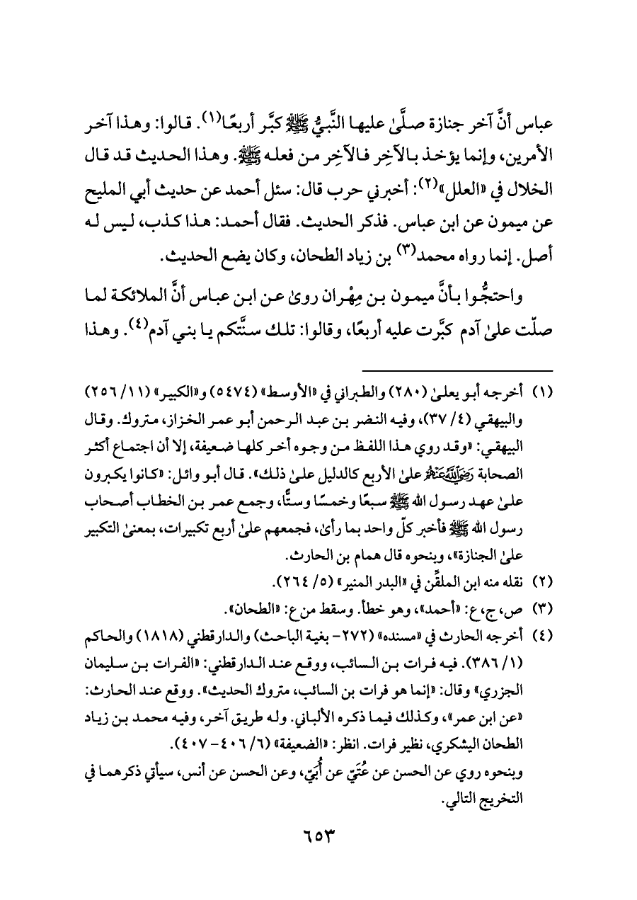عباس أنَّ آخر جنازة صلَّى عليها النَّبيُّ - صلى الله عليه وسلم - كبَّر أربعًا (¬١). قالوا: وهذا آخر الأمرين، وإنما يؤخذ بالآخِر فالآخِر من فعله - صلى الله عليه وسلم -. وهذا الحديث قد قال الخلال في «العلل» (¬٢): أخبرني حرب قال: سئل أحمد عن حديث أبي المليح عن ميمون عن ابن عباس. فذكر الحديث. فقال أحمد: هذا كذب، ليس له أصل. إنما رواه محمد (¬٣) بن زياد الطحان، وكان يضع الحديث.