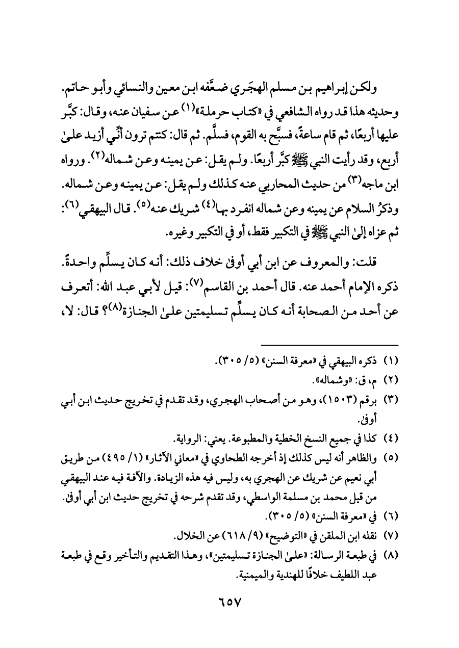 ولكن إبراهيم بن مسلم الهجَري ضعَّفه ابن معين والنسائي وأبو حاتم. وحديثه هذا قد رواه الشافعي في «كتاب حرملة» (¬١) عن سفيان عنه، وقال: كبَّر عليها أربعًا، ثم قام ساعةً، فسبَّح به القوم، فسلَّم. ثم قال: كنتم ترون أنِّي أزيد على أربع، وقد رأيت النبي - صلى الله عليه وسلم - كبَّر أربعًا. ولم يقل: عن يمينه وعن شماله (¬٢). ورواه ابن ماجه (¬٣) من حديث المحاربي عنه كذلك ولم يقل: عن يمينه وعن شماله. وذكرُ السلام عن يمينه وعن شماله انفرد بها (¬٤) شريك عنه (¬٥). قال البيهقي (¬٦): ثم عزاه إلى النبي - صلى الله عليه وسلم - في التكبير فقط, أو في التكبير وغيره.