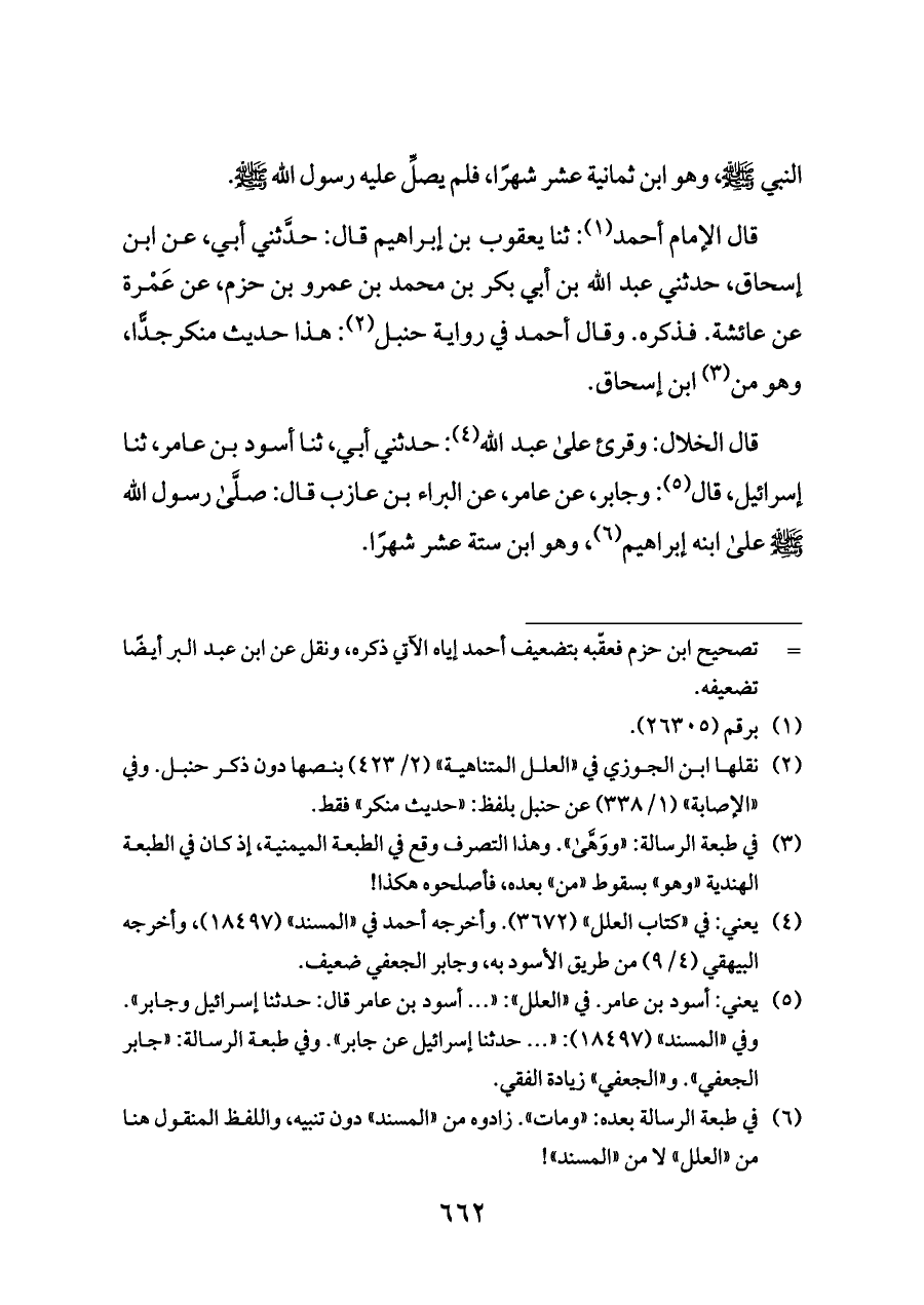 قال الخلال: وقرئ على عبد الله (¬٤): حدثني أبي، ثنا أسود بن عامر، ثنا إسرائيل، قال (¬٥): وجابر، عن عامر، عن البراء بن عازب قال: صلَّى رسول الله - صلى الله عليه وسلم - على ابنه إبراهيم (¬٦)، وهو ابن ستة عشر شهرًا.