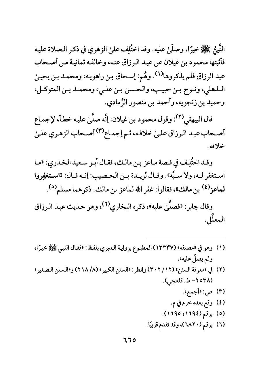 النَّبيُّ - صلى الله عليه وسلم - خيرًا، وصلّى عليه. وقد اختُلِف على الزهري في ذكر الصلاة عليه فأثبتها محمود بن غيلان عن عبد الرزاق عنه، وخالفه ثمانية من أصحاب عبد الرزاق فلم يذكروها (¬١). وهُم: إسحاق بن راهويه، ومحمد بن يحيى الذهلي، ونوح بن حبيب، والحسن بن علي، ومحمد بن المتوكل، وحميد بن زنجويه، وأحمد بن منصور الرَّمادي.