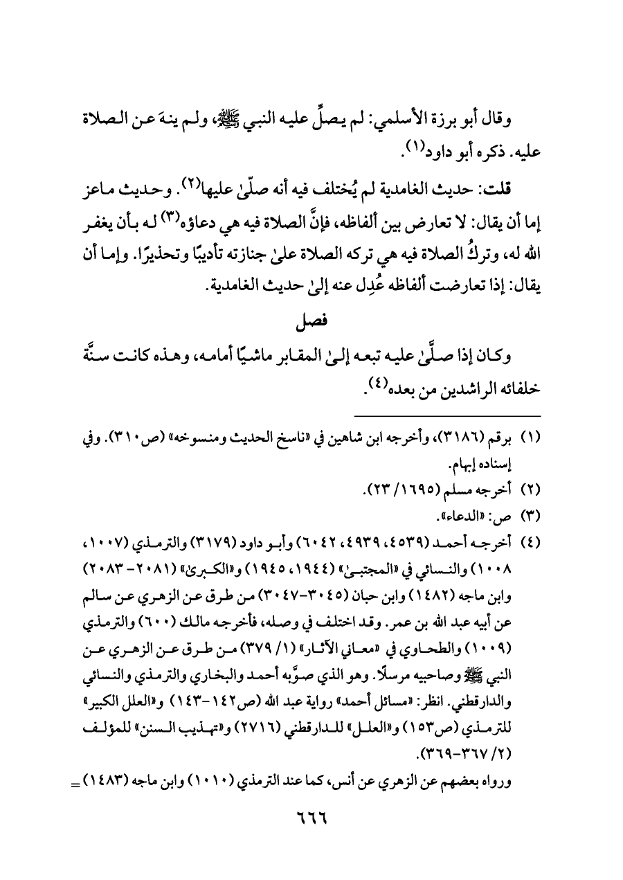 قلت: حديث الغامدية لم يُختلف فيه أنه صلّى عليها (¬٢). وحديث ماعز إما أن يقال: لا تعارض بين ألفاظه، فإنَّ الصلاة فيه هي دعاؤه (¬٣) له بأن يغفر الله له، وتركُ الصلاة فيه هي تركه الصلاة على جنازته تأديبًا وتحذيرًا. وإما أن يقال: إذا تعارضت ألفاظه عُدِل عنه إلى حديث الغامدية.