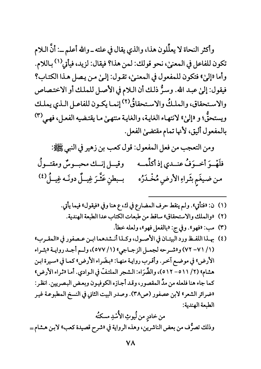 (¬٤) بهذا اللفظ ورد البيتان في الأصول، وكذا أنشدهما ابن عصفور في «المقرب» (١/ ٧١ - ٧٢) و «شرحه لجمل الزجاجي» (١/ ٥٧٧)، ولم أجد رواية «بثراء الأرض» في موضع آخر. وأقرب رواية منها: «بضَراء الأرض» كما في «سيرة ابن هشام» (٢/ ٥١١ - ٥١٢)، والضَّرَاء: الشجر الملتفّ في الوادي. أما «ثراء الأرض» كما جاء هنا فلعله من مدِّ المقصور، وقد أجازه الكوفيون وبعض البصريين. انظر: «ضرائر الشعر» لابن عصفور (ص ٣٨). وصدر البيت الثاني في النسخ المطبوعة غير الطبعة الهندية:
