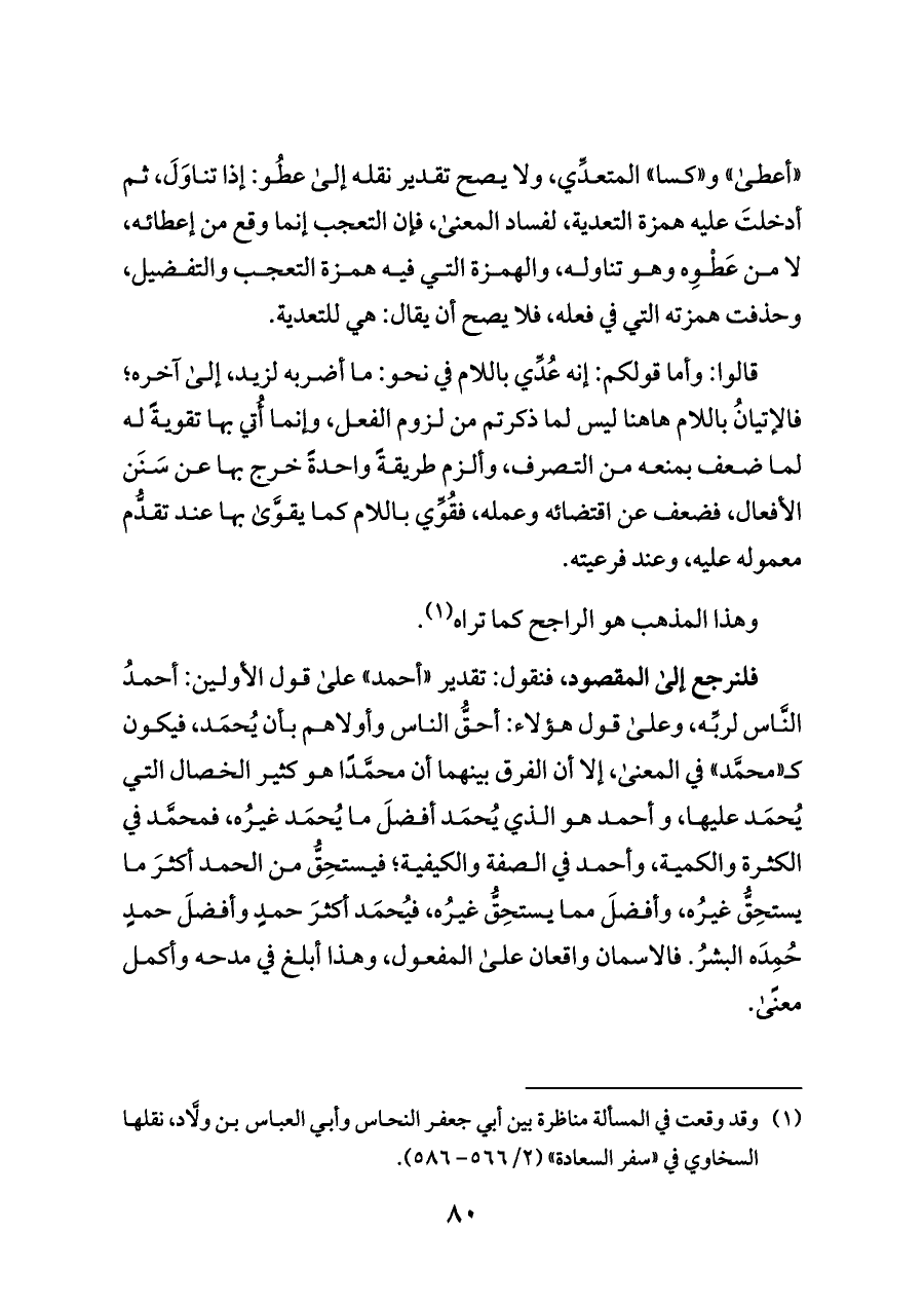 (¬١) وقد وقعت في المسألة مناظرة بين أبي جعفر النحاس وأبي العباس بن ولَّاد، نقلها السخاوي في «سفر السعادة» (٢/ ٥٦٦ - ٥٨٦).