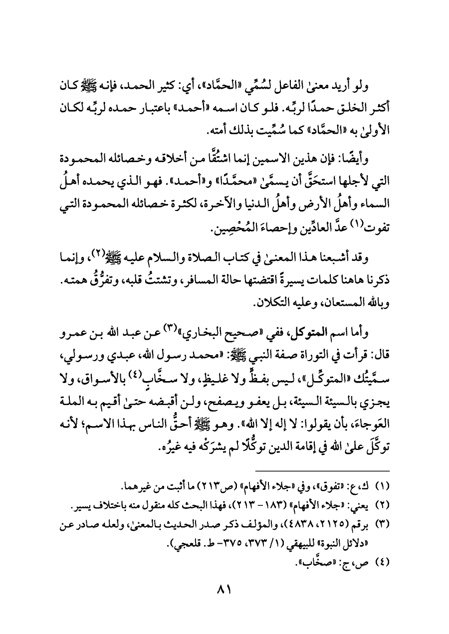 ولو أريد معنى الفاعل لسُمِّي «الحمَّاد»، أي: كثير الحمد، فإنه - صلى الله عليه وسلم - كان أكثر الخلق حمدًا لربِّه. فلو كان اسمه «أحمد» باعتبار حمده لربِّه لكان الأولى به «الحمَّاد» كما سُمِّيت بذلك أمته.