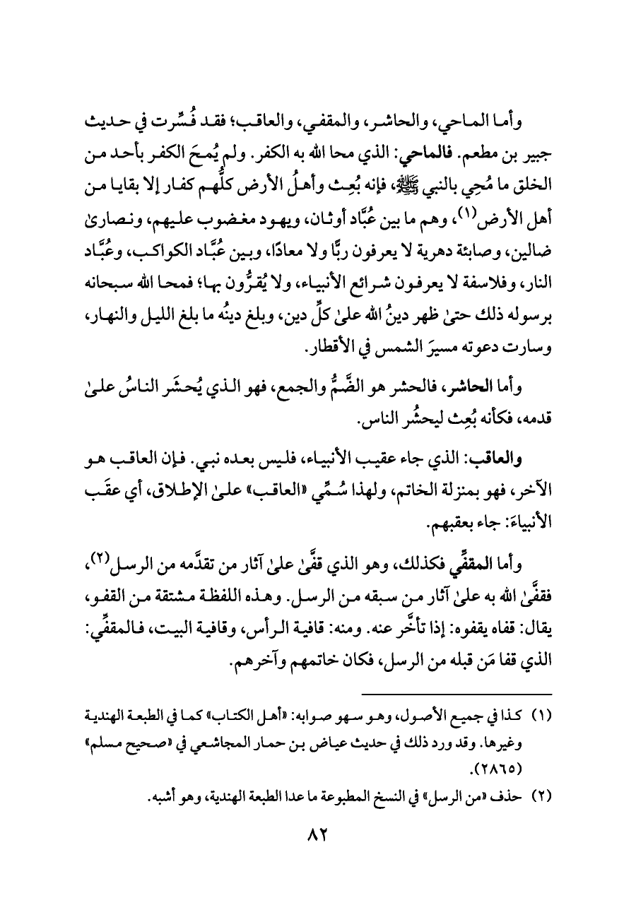 وأما الماحي، والحاشر، والمقفي، والعاقب؛ فقد فُسِّرت في حديث جبير بن مطعم. فالماحي: الذي محا الله به الكفر. ولم يُمحَ الكفر بأحد من الخلق ما مُحِي بالنبي - صلى الله عليه وسلم -، فإنه بُعِث وأهلُ الأرض كلُّهم كفار إلا بقايا من أهل الأرض (¬١)، وهم ما بين عُبَّاد أوثان، ويهود مغضوب عليهم، ونصارى ضالين، وصابئة دهرية لا يعرفون ربًّا ولا معادًا، وبين عُبَّاد الكواكب، وعُبَّاد النار، وفلاسفة لا يعرفون شرائع الأنبياء، ولا يُقرُّون بها؛ فمحا الله سبحانه برسوله ذلك حتى ظهر دينُ الله على كلِّ دين، وبلغ دينُه ما بلغ الليل والنهار، وسارت دعوته مسيرَ الشمس في الأقطار.