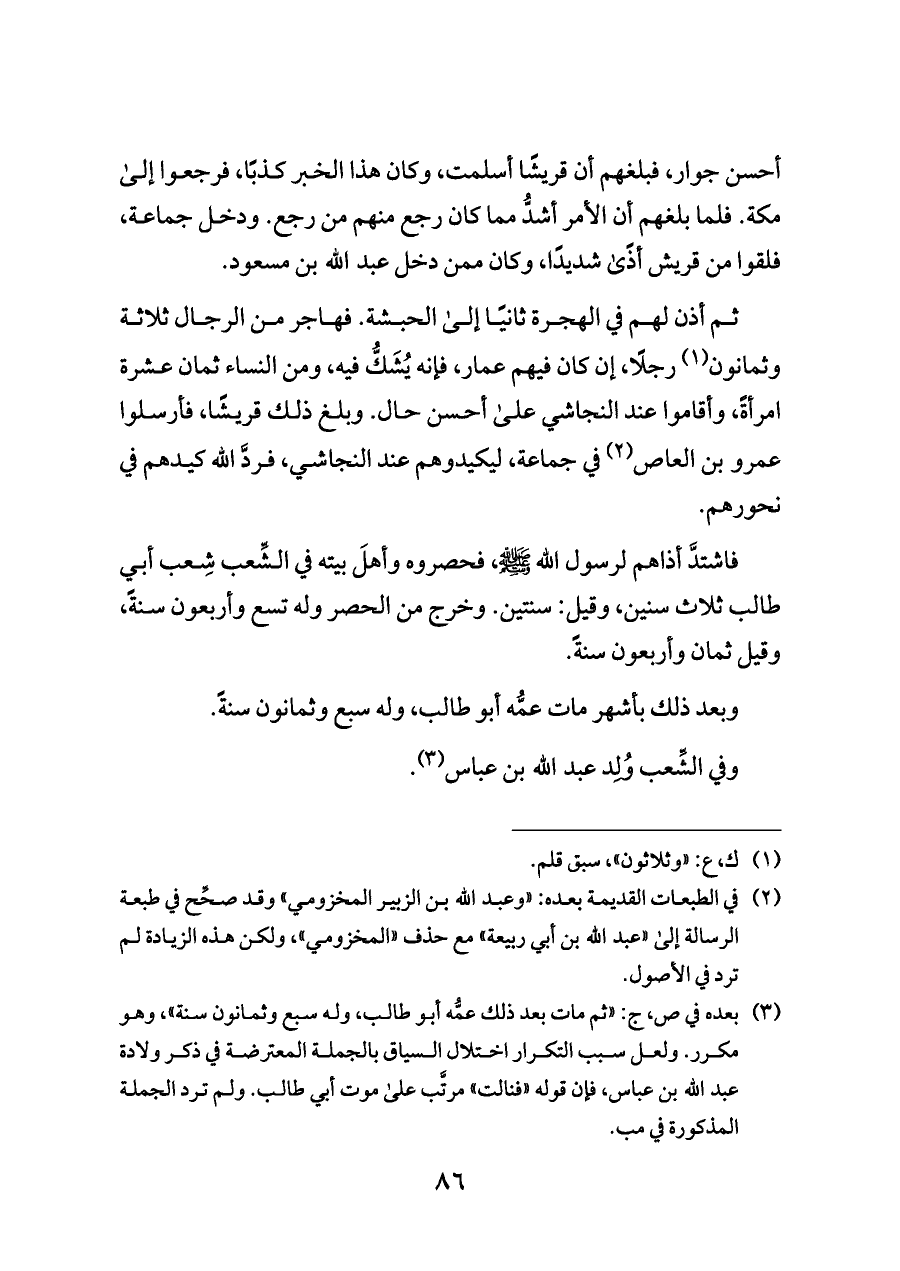 (¬٣) بعده في ص، ج: «ثم مات بعد ذلك عمُّه أبو طالب، وله سبع وثمانون سنة»، وهو مكرر. ولعل سبب التكرار اختلال السياق بالجملة المعترضة في ذكر ولادة عبد الله بن عباس، فإن قوله «فنالت» مرتَّب على موت أبي طالب. ولم ترد الجملة المذكورة في مب.