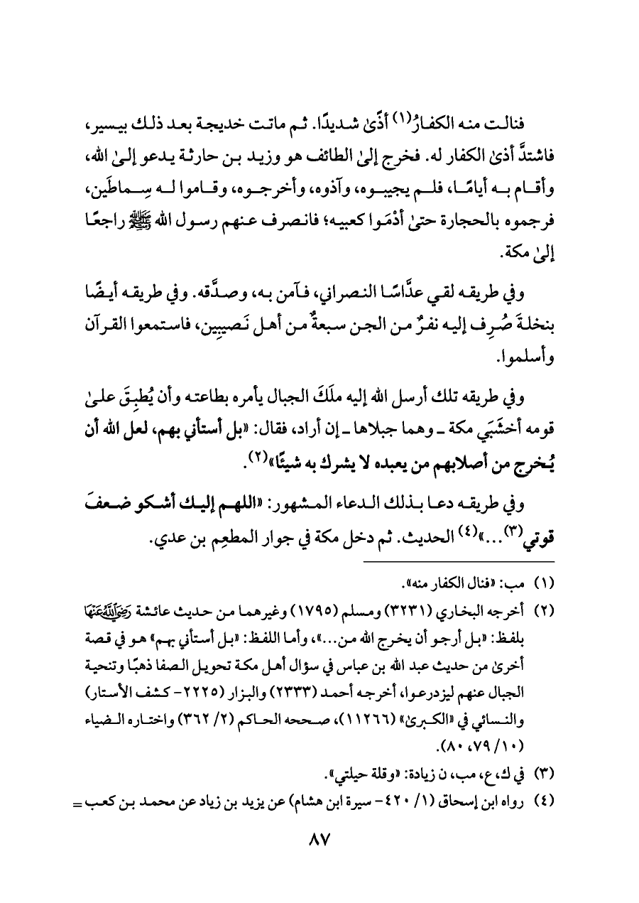 وفي طريقه دعا بذلك الدعاء المشهور: «اللهم إليك أشكو ضعفَ قوتي (¬٣) ... » (¬٤) الحديث. ثم دخل مكة في جوار المطعِم بن عدي.