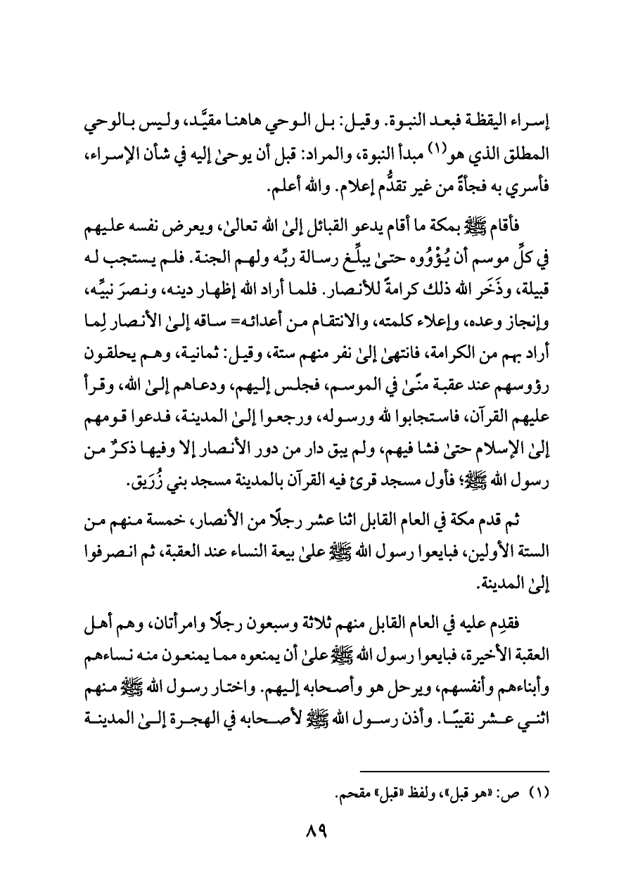 فأقام - صلى الله عليه وسلم - بمكة ما أقام يدعو القبائل إلى الله تعالى، ويعرض نفسه عليهم في كلِّ موسم أن يُؤْوُوه حتى يبلِّغ رسالة ربِّه ولهم الجنة. فلم يستجب له قبيلة، وذَخَر الله ذلك كرامةً للأنصار. فلما أراد الله إظهار دينه، ونصرَ نبيِّه، وإنجاز وعده، وإعلاء كلمته، والانتقام من أعدائه= ساقه إلى الأنصار لِما أراد بهم من الكرامة، فانتهى إلى نفر منهم ستة، وقيل: ثمانية، وهم يحلقون رؤوسهم عند عقبة منًى في الموسم، فجلس إليهم، ودعاهم إلى الله، وقرأ عليهم القرآن، فاستجابوا لله ورسوله، ورجعوا إلى المدينة، فدعوا قومهم إلى الإسلام حتى فشا فيهم، ولم يبق دار من دور الأنصار إلا وفيها ذكرٌ من رسول الله - صلى الله عليه وسلم -؛ فأول مسجد قرئ فيه القرآن بالمدينة مسجد بني زُرَيق.