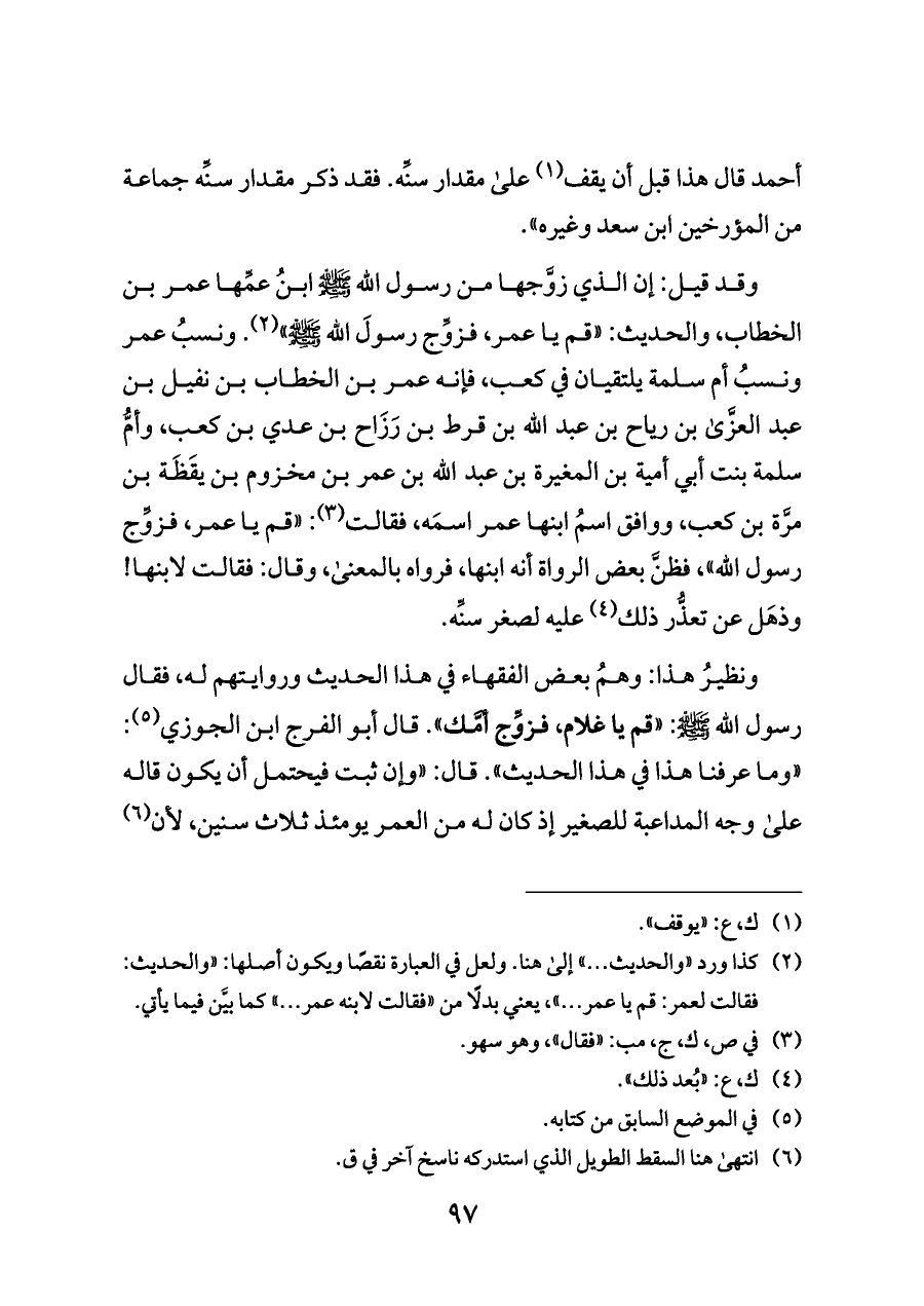 (¬٢) كذا ورد «والحديث ... » إلى هنا. ولعل في العبارة نقصًا ويكون أصلها: «والحديث: فقالت لعمر: قم يا عمر ... »، يعني بدلًا من «فقالت لابنه عمر ... » كما بيَّن فيما يأتي.