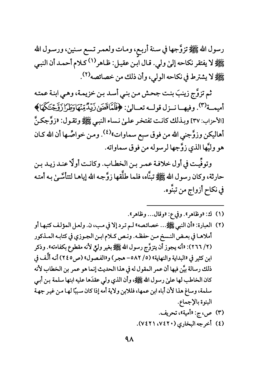 (¬٢) العبارة: «أن النبي - صلى الله عليه وسلم - ... خصائصه» لم ترد إلا في مب، ن. ولعل المؤلف كتبها أو أملاها في بعض النسخ من حفظه. ونص كلام ابن الجوزي في كتابه المذكور (٢/ ٢٦٦): «أنه يجوز أن يتزوَّج رسول الله - صلى الله عليه وسلم - بغير وليٍّ لأنه مقطوع بكفاءته». وذكر ابن كثير في «البداية والنهاية» (٥/ ٥٨٢ - هجر) و «الفصول» (ص ٢٤٥) أنه ألَّف في ذلك رسالة بيَّن فيها أن عمر المقول له في هذا الحديث إنما هو عمر بن الخطاب لأنه كان الخاطب لها على رسول الله - صلى الله عليه وسلم -، وأن الذي ولي عقدَها عليه ابنها سلمة بن أبي سلمة، وساغ هذا لأن أباه ابن عمها، فللابن ولاية أمه إذا كان سببًا لها من غير جهة البنوة بالإجماع.