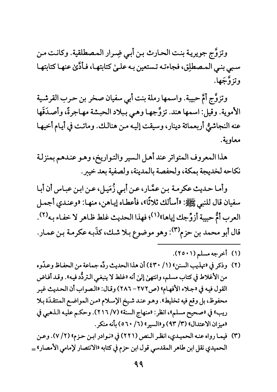 وأما حديث عكرمة بن عمَّار، عن أبي زُمَيل، عن ابن عباس أن أبا سفيان قال للنبي - صلى الله عليه وسلم -: «أسألك ثلاثًا»، فأعطاه إياهن، منها: «وعندي أجمل العرب أمُّ حبيبة أزوِّجك إياها» (¬١)؛ فهذا الحديث غلط ظاهر لا خفاء به (¬٢). قال أبو محمد بن حزم (¬٣): وهو موضوع بلا شك، كذَبه عكرمة بن عمار.