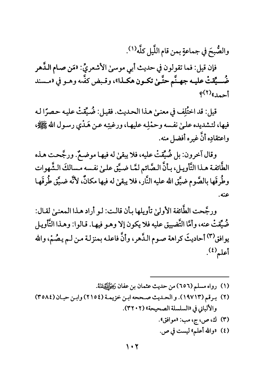ورجَّحت الطَّائفة الأولى تأويلها بأن قالت: لو أراد هذا المعنى لقال: ضُيِّقتْ عنه، وأمَّا التَّضييق عليه فلا يكون إلا وهو فيها. قالوا: وهذا التَّأويل يوافق (¬٣) أحاديثَ كراهة صوم الدَّهر، وأنَّ فاعله بمنزلة من لم يصُمْ، والله أعلم (¬٤).