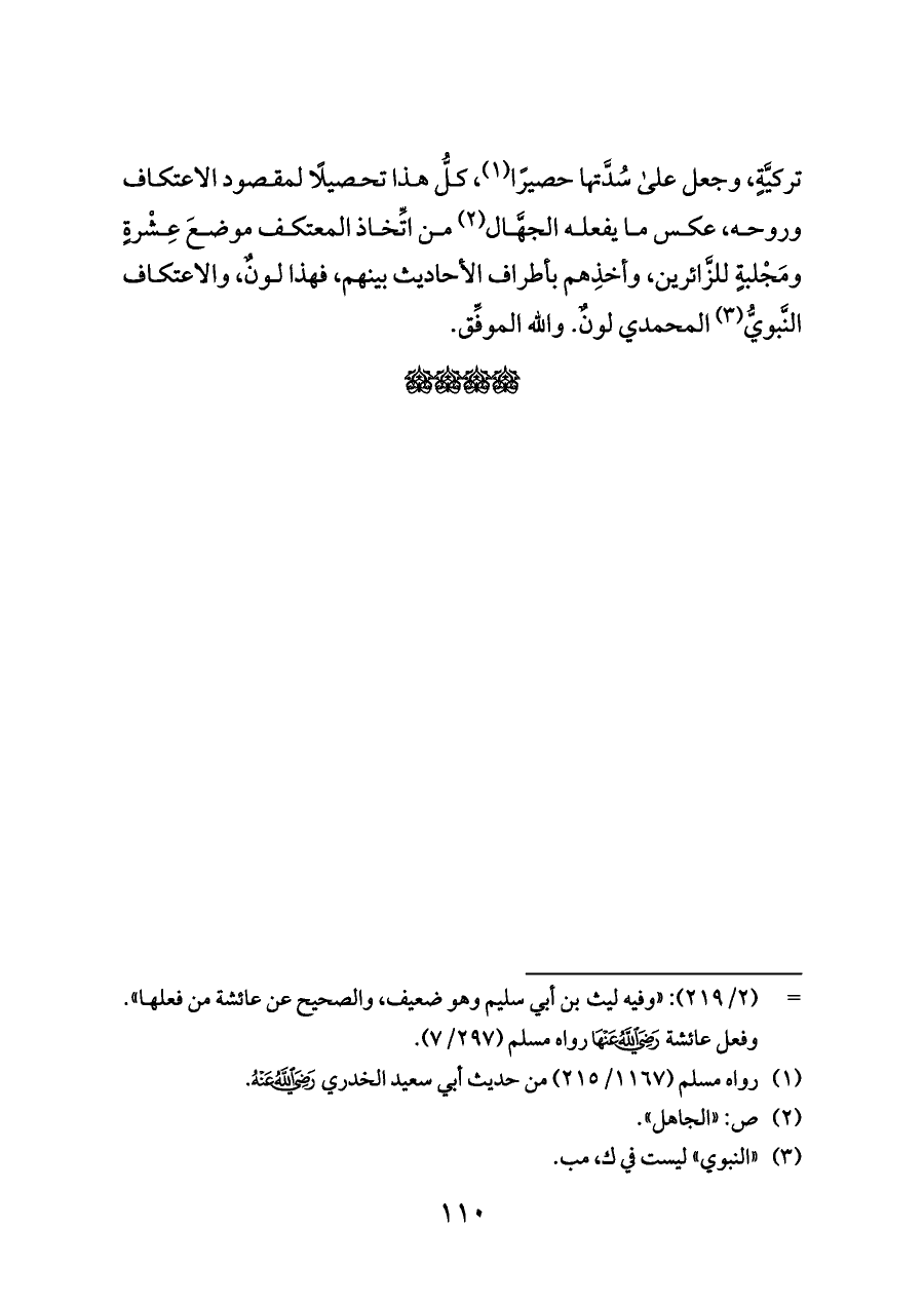 تركيَّةٍ، وجعل على سُدَّتها حصيرًا (¬١)، كلُّ هذا تحصيلًا لمقصود الاعتكاف وروحه، عكس ما يفعله الجهَّال (¬٢) من اتِّخاذ المعتكف موضعَ عِشْرةٍ ومَجْلبةٍ للزَّائرين، وأخذِهم بأطراف الأحاديث بينهم، فهذا لونٌ، والاعتكاف النَّبويُّ (¬٣) المحمدي لونٌ. والله الموفِّق.