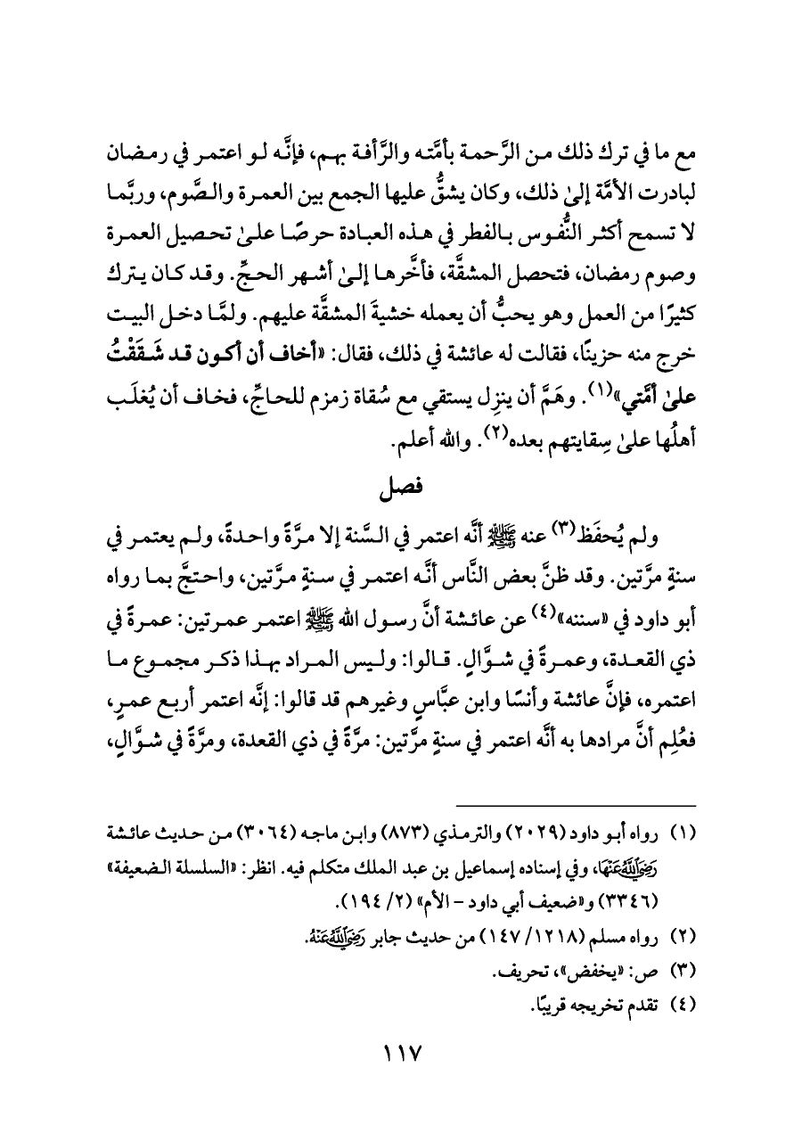 ولم يُحفَظ (¬٣) عنه - صلى الله عليه وسلم - أنَّه اعتمر في السَّنة إلا مرَّةً واحدةً، ولم يعتمر في سنةٍ مرَّتين. وقد ظنَّ بعض النَّاس أنَّه اعتمر في سنةٍ مرَّتين، واحتجَّ بما رواه أبو داود في «سننه» (¬٤) عن عائشة أنَّ رسول الله - صلى الله عليه وسلم - اعتمر عمرتين: عمرةً في ذي القعدة، وعمرةً في شوَّالٍ. قالوا: وليس المراد بهذا ذكر مجموع ما اعتمره، فإنَّ عائشة وأنسًا وابن عبَّاسٍ وغيرهم قد قالوا: إنَّه اعتمر أربع عمرٍ، فعُلِم أنَّ مرادها به أنَّه اعتمر في سنةٍ مرَّتين: مرَّةً في ذي القعدة، ومرَّةً في شوَّالٍ،