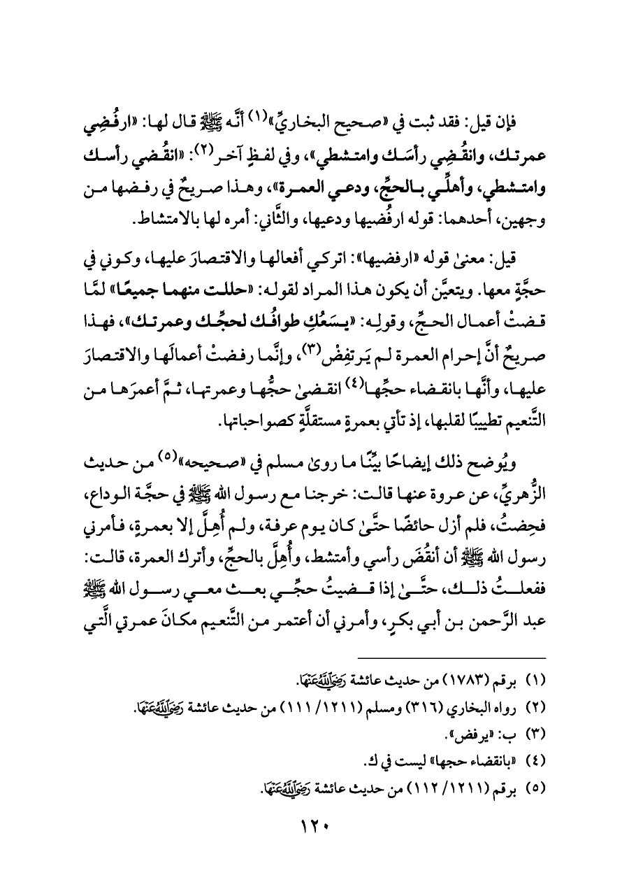 قيل: معنى قوله «ارفضيها»: اتركي أفعالها والاقتصارَ عليها، وكوني في حجَّةٍ معها. ويتعيَّن أن يكون هذا المراد لقوله: «حللت منهما جميعًا» لمَّا قضتْ أعمال الحجِّ، وقولِه: «يسَعُكِ طوافُك لحجِّك وعمرتك»، فهذا صريحٌ أنَّ إحرام العمرة لم يَرتفِضْ (¬٣)، وإنَّما رفضتْ أعمالَها والاقتصارَ عليها، وأنَّها بانقضاء حجِّها (¬٤) انقضى حجُّها وعمرتها، ثمَّ أعمرَها من التَّنعيم تطييبًا لقلبها، إذ تأتي بعمرةٍ مستقلَّةٍ كصواحباتها.