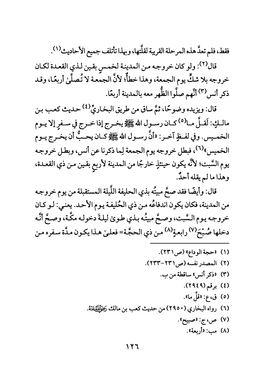 قال: ويزيده وضوحًا، ثمَّ ساق من طريق البخاريِّ (¬٤) حديث كعب بن مالكٍ: لَقلَّ ما (¬٥) كان رسول الله - صلى الله عليه وسلم - يخرج إذا خرج في سفرٍ إلا يوم الخميس. وفي لفظٍ آخر: «أنَّ رسول الله - صلى الله عليه وسلم - كان يحبُّ أن يخرج يوم الخميس» (¬٦)، فبطل خروجه يوم الجمعة لِما ذكرنا عن أنس، وبطل خروجه يوم السَّبت؛ لأنَّه يكون حينئذٍ خارجًا من المدينة لأربعٍ بقين من ذي القعدة، وهذا ما لم يقله أحدٌ.