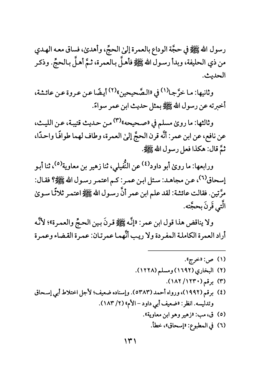 ورابعها: ما روى أبو داود (¬٤) عن النُّفيلي، ثنا زهير بن معاوية (¬٥)، ثنا أبو إسحاق (¬٦)، عن مجاهد: سئل ابن عمر: كم اعتمر رسول الله - صلى الله عليه وسلم -؟ فقال: مرَّتين. فقالت عائشة: لقد علم ابن عمر أنَّ رسول الله - صلى الله عليه وسلم - اعتمر ثلاثًا سوى الَّتي قَرنَ بحجَّته.