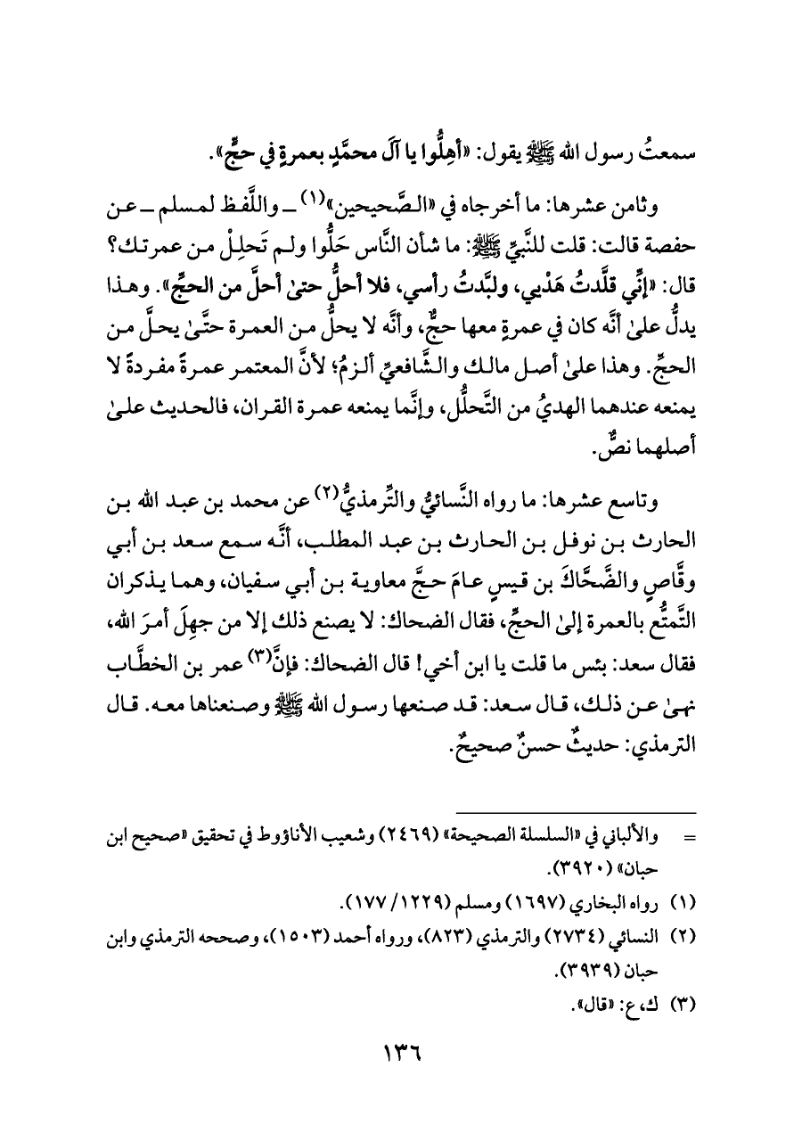وتاسع عشرها: ما رواه النَّسائيُّ والتِّرمذيُّ (¬٢) عن محمد بن عبد الله بن الحارث بن نوفل بن الحارث بن عبد المطلب، أنَّه سمع سعد بن أبي وقَّاصٍ والضَّحَّاكَ بن قيسٍ عامَ حجَّ معاوية بن أبي سفيان، وهما يذكران التَّمتُّع بالعمرة إلى الحجِّ، فقال الضحاك: لا يصنع ذلك إلا من جهِلَ أمرَ اللَّه، فقال سعد: بئس ما قلت يا ابن أخي! قال الضحاك: فإنَّ (¬٣) عمر بن الخطَّاب نهى عن ذلك، قال سعد: قد صنعها رسول الله - صلى الله عليه وسلم - وصنعناها معه. قال الترمذي: حديثٌ حسنٌ صحيحٌ.