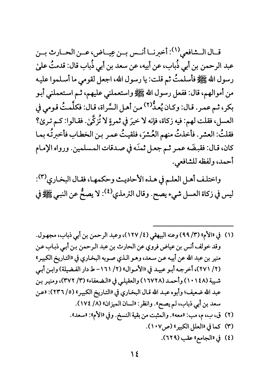 قال الشافعي (¬١): أخبرنا أنس بن عِياض، عن الحارث بن عبد الرحمن بن أبي ذُباب، عن أبيه، عن سعد بن أبي ذُباب قال: قدمتُ على رسول الله - صلى الله عليه وسلم - فأسلمتُ ثم قلت: يا رسول الله، اجعل لقومي ما أسلموا عليه من أموالهم، قال: ففعل رسول الله - صلى الله عليه وسلم - واستعملني عليهم، ثم استعملني أبو بكر، ثم عمر. قال: وكان يُعدُّ (¬٢) من أهل السَّراة، قال: فكلَّمتُ قومي في العسل، فقلت لهم: فيه زكاة، فإنه لا خيرَ في ثمرةٍ لا تُزكَّى. فقالوا: كم ترى؟ فقلتُ: العشر. فأخذتُ منهم العُشرَ، فلقيتُ عمر بن الخطاب فأخبرتُه بما كان، قال: فقبضَه عمر ثم جعل ثمنَه في صدقات المسلمين. ورواه الإمام أحمد، ولفظه للشافعي.