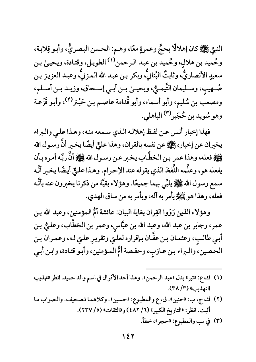 النبيِّ - صلى الله عليه وسلم - كان إهلالًا بحجٍّ وعمرةٍ معًا، وهم: الحسن البصريُّ، وأبو قِلابة، وحُميد بن هلالٍ، وحُميد بن عبد الرحمن (¬١) الطويل، وقتادة، ويحيى بن سعيدٍ الأنصاريُّ، وثابتٌ البُنانيُّ، وبكر بن عبد الله المزنيُّ، وعبد العزيز بن صُهيبٍ، وسليمان التَّيميُّ، ويحيى بن أبي إسحاق، وزيد بن أسلم، ومصعب بن سُليم، وأبو أسماء، وأبو قُدامة عاصم بن حَبْتر (¬٢)، وأبو قَزَعة وهو سُويد بن حُجَير (¬٣) الباهلي.