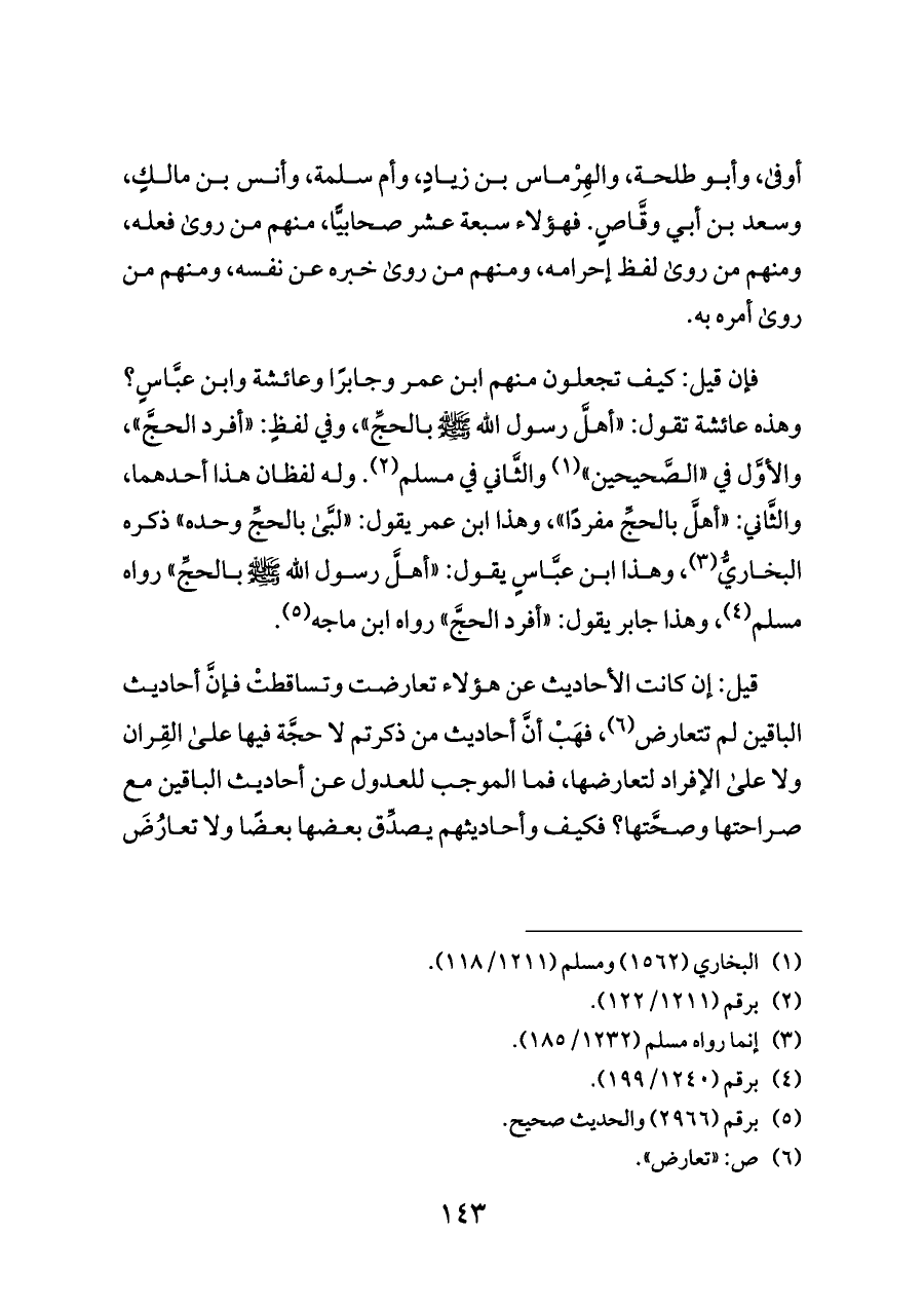 قيل: إن كانت الأحاديث عن هؤلاء تعارضت وتساقطتْ فإنَّ أحاديث الباقين لم تتعارض (¬٦)، فهَبْ أنَّ أحاديث من ذكرتم لا حجَّة فيها على القِران ولا على الإفراد لتعارضها، فما الموجب للعدول عن أحاديث الباقين مع صراحتها وصحَّتها؟ فكيف وأحاديثهم يصدِّق بعضها بعضًا ولا تعارُضَ