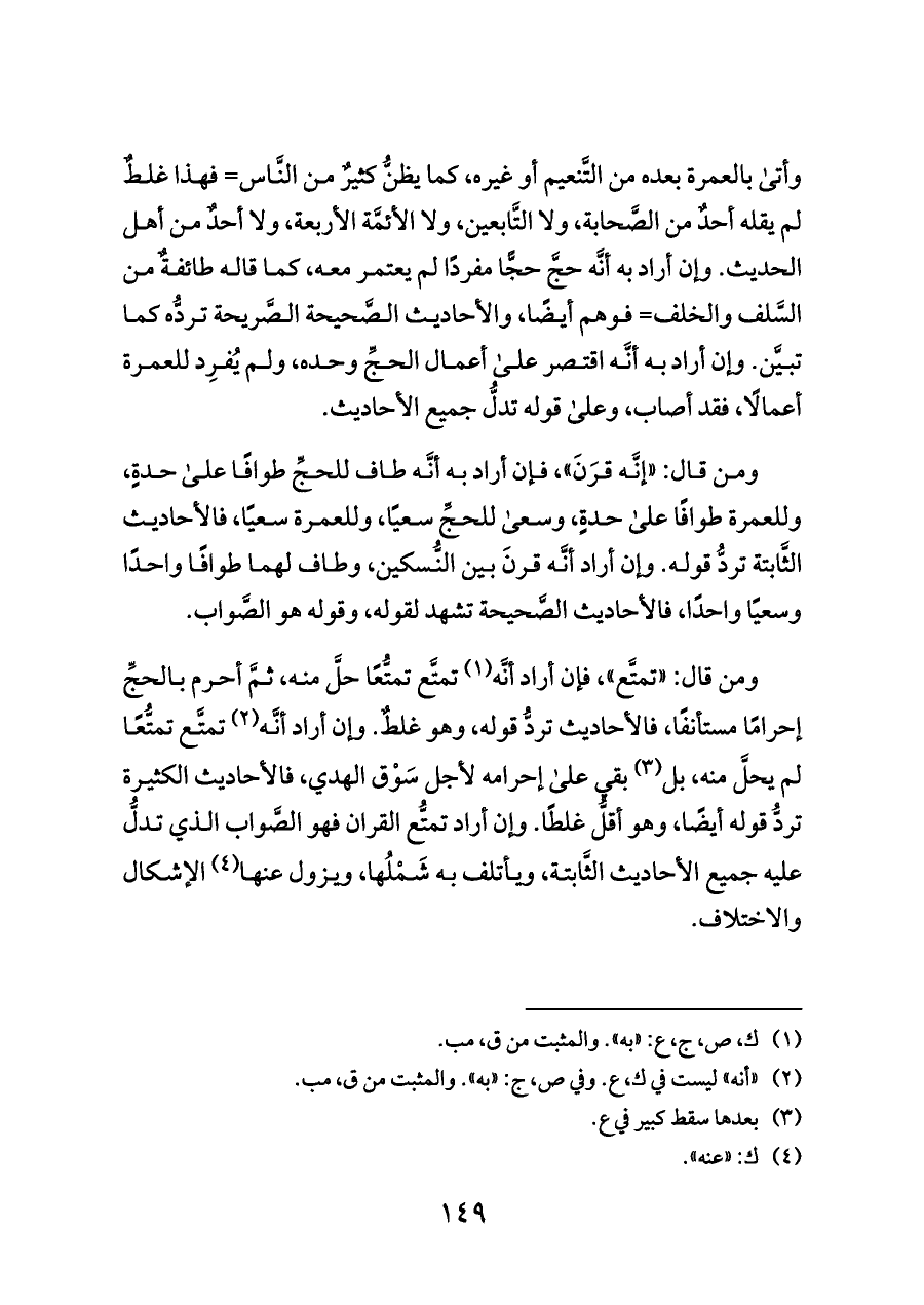 وأتى بالعمرة بعده من التَّنعيم أو غيره، كما يظنُّ كثيرٌ من النَّاس= فهذا غلطٌ لم يقله أحدٌ من الصَّحابة، ولا التَّابعين، ولا الأئمَّة الأربعة، ولا أحدٌ من أهل الحديث. وإن أراد به أنَّه حجَّ حجًّا مفردًا لم يعتمر معه، كما قاله طائفةٌ من السَّلف والخلف= فوهم أيضًا، والأحاديث الصَّحيحة الصَّريحة تردُّه كما تبيَّن. وإن أراد به أنَّه اقتصر على أعمال الحجِّ وحده، ولم يُفرِد للعمرة أعمالًا، فقد أصاب، وعلى قوله تدلُّ جميع الأحاديث.