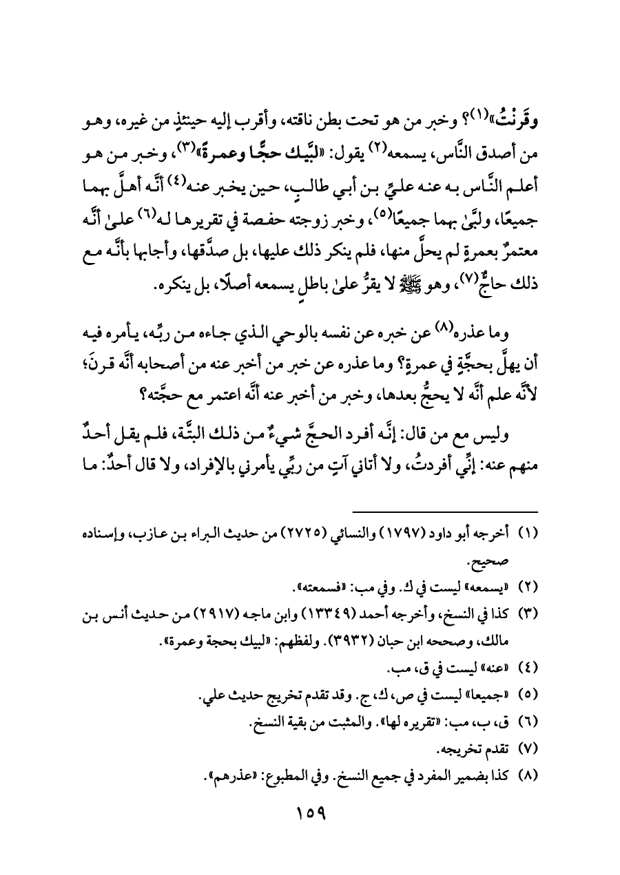 وقَرنْتُ» (¬١)؟ وخبر من هو تحت بطن ناقته، وأقرب إليه حينئذٍ من غيره، وهو من أصدق النَّاس، يسمعه (¬٢) يقول: «لبَّيك حجًّا وعمرةً» (¬٣)، وخبر من هو أعلم النَّاس به عنه عليِّ بن أبي طالبٍ، حين يخبر عنه (¬٤) أنَّه أهلَّ بهما جميعًا، ولبَّى بهما جميعًا (¬٥)، وخبر زوجته حفصة في تقريرها له (¬٦) على أنَّه معتمرٌ بعمرةٍ لم يحلَّ منها، فلم ينكر ذلك عليها، بل صدَّقها، وأجابها بأنَّه مع ذلك حاجٌّ (¬٧)، وهو - صلى الله عليه وسلم - لا يقرُّ على باطلٍ يسمعه أصلًا، بل ينكره.