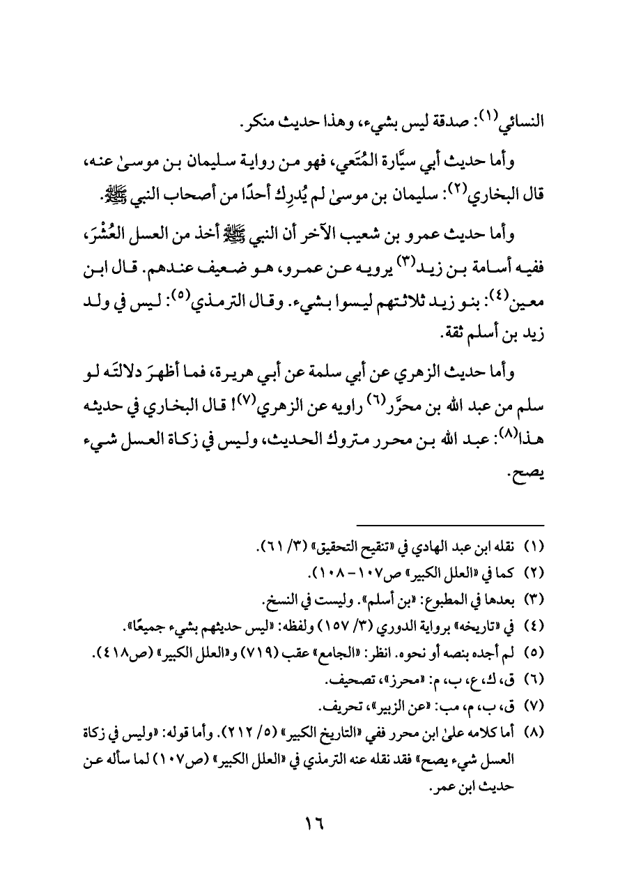 (¬٨) أما كلامه على ابن محرر ففي «التاريخ الكبير» (٥/ ٢١٢). وأما قوله: «وليس في زكاة العسل شيء يصح» فقد نقله عنه الترمذي في «العلل الكبير» (ص ١٠٧) لما سأله عن حديث ابن عمر.