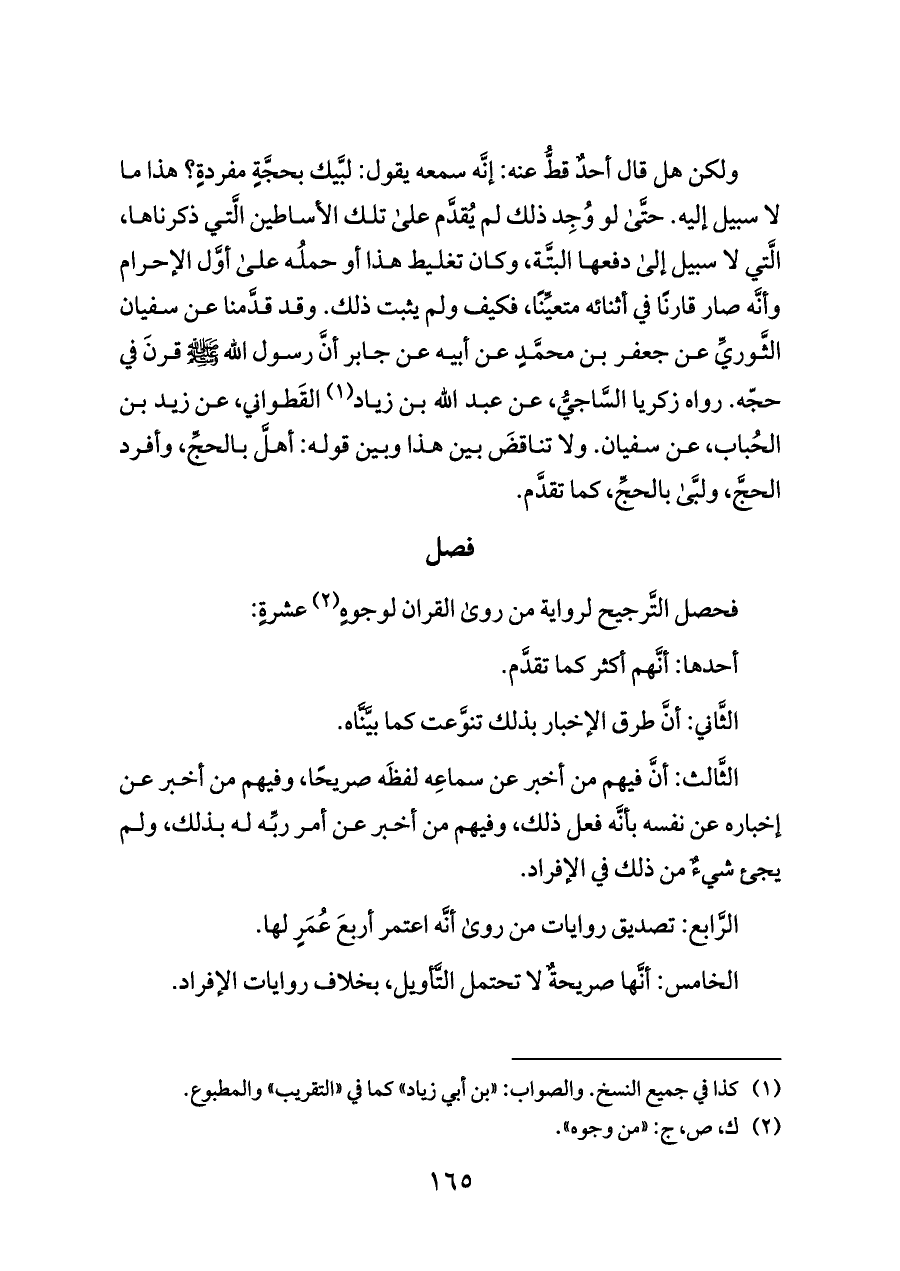 ولكن هل قال أحدٌ قطُّ عنه: إنَّه سمعه يقول: لبَّيك بحجَّةٍ مفردةٍ؟ هذا ما لا سبيل إليه. حتَّى لو وُجِد ذلك لم يُقدَّم على تلك الأساطين الَّتي ذكرناها، الَّتي لا سبيل إلى دفعها البتَّة، وكان تغليط هذا أو حملُه على أوَّل الإحرام وأنَّه صار قارنًا في أثنائه متعيِّنًا، فكيف ولم يثبت ذلك. وقد قدَّمنا عن سفيان الثَّوريِّ عن جعفر بن محمَّدٍ عن أبيه عن جابر أنَّ رسول الله - صلى الله عليه وسلم - قرنَ في حجّه. رواه زكريا السَّاجيُّ، عن عبد الله بن زياد (¬١) القَطواني، عن زيد بن الحُباب، عن سفيان. ولا تناقضَ بين هذا وبين قوله: أهلَّ بالحجِّ، وأفرد الحجَّ، ولبَّى بالحجِّ، كما تقدَّم.