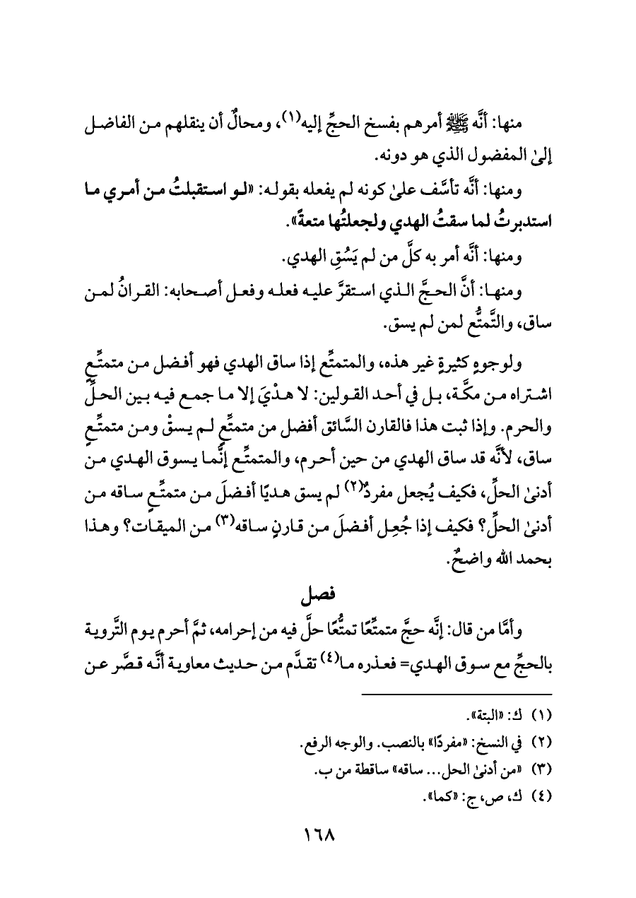 ولوجوهٍ كثيرةٍ غير هذه، والمتمتِّع إذا ساق الهدي فهو أفضل من متمتِّعٍ اشتراه من مكَّة، بل في أحد القولين: لا هدْيَ إلا ما جمع فيه بين الحلِّ والحرم. وإذا ثبت هذا فالقارن السَّائق أفضل من متمتِّعٍ لم يسقْ ومن متمتِّعٍ ساق، لأنَّه قد ساق الهدي من حين أحرم، والمتمتِّع إنَّما يسوق الهدي من أدنى الحلِّ، فكيف يُجعل مفردٌ (¬٢) لم يسق هديًا أفضلَ من متمتِّعٍ ساقه من أدنى الحلِّ؟ فكيف إذا جُعِل أفضلَ من قارنٍ ساقه (¬٣) من الميقات؟ وهذا بحمد الله واضحٌ.