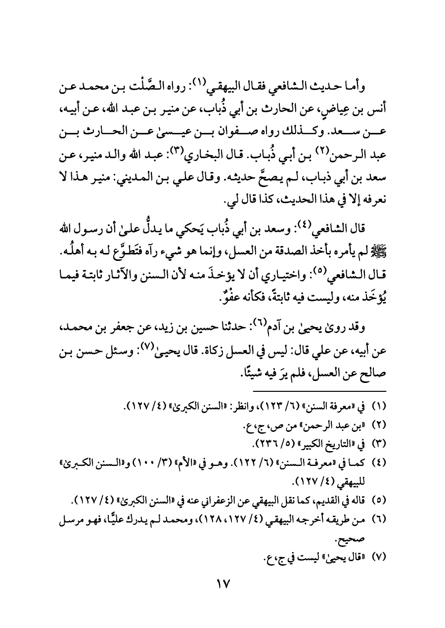 قال الشافعي (¬٤): وسعد بن أبي ذُباب يَحكي ما يدلُّ على أن رسول الله - صلى الله عليه وسلم - لم يأمره بأخذ الصدقة من العسل، وإنما هو شيء رآه فتَطوَّع له به أهلُه. قال الشافعي (¬٥): واختياري أن لا يؤخذَ منه لأن السنن والآثار ثابتة فيما يُؤخَذ منه، وليست فيه ثابتةً، فكأنه عفْوٌ.