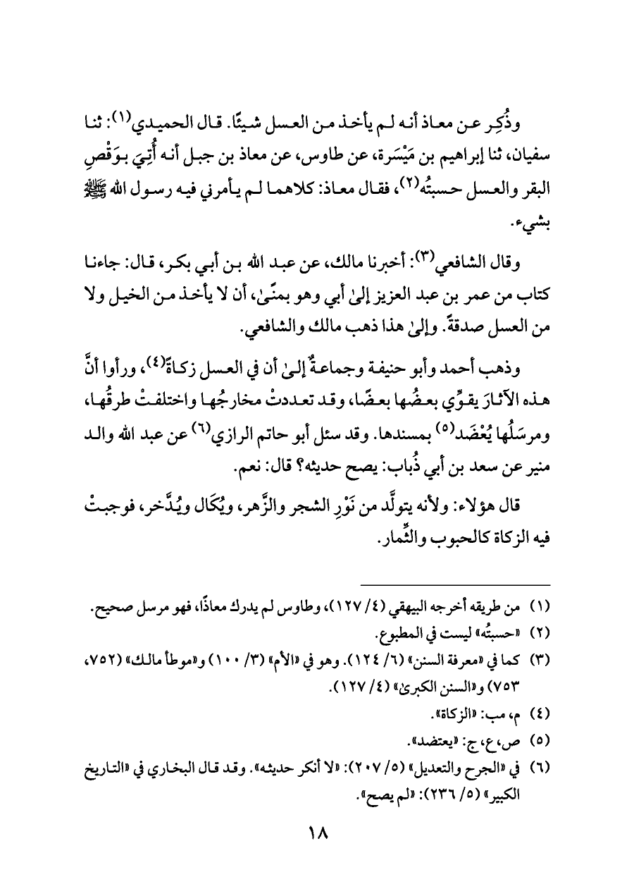 وذهب أحمد وأبو حنيفة وجماعةٌ إلى أن في العسل زكاةً (¬٤)، ورأوا أنَّ هذه الآثارَ يقوِّي بعضُها بعضًا، وقد تعددتْ مخارجُها واختلفتْ طرقُها، ومرسَلُها يُعْضَد (¬٥) بمسندها. وقد سئل أبو حاتم الرازي (¬٦) عن عبد الله والد منير عن سعد بن أبي ذُباب: يصح حديثه؟ قال: نعم.