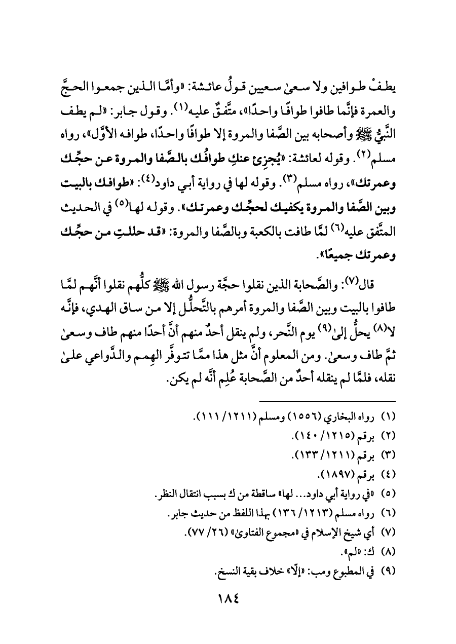 يطفْ طوافين ولا سعى سعيين قولُ عائشة: «وأمَّا الذين جمعوا الحجَّ والعمرة فإنَّما طافوا طوافًا واحدًا»، متَّفقٌ عليه (¬١). وقول جابر: «لم يطف النَّبيُّ - صلى الله عليه وسلم - وأصحابه بين الصَّفا والمروة إلا طوافًا واحدًا، طوافه الأوَّل»، رواه مسلم (¬٢). وقوله لعائشة: «يُجزِئ عنكِ طوافُك بالصَّفا والمروة عن حجِّك وعمرتك»، رواه مسلم (¬٣). وقوله لها في رواية أبي داود (¬٤): «طوافك بالبيت وبين الصَّفا والمروة يكفيك لحجِّك وعمرتك». وقوله لها (¬٥) في الحديث المتَّفق عليه (¬٦) لمَّا طافت بالكعبة وبالصَّفا والمروة: «قد حللتِ من حجِّك وعمرتك جميعًا».