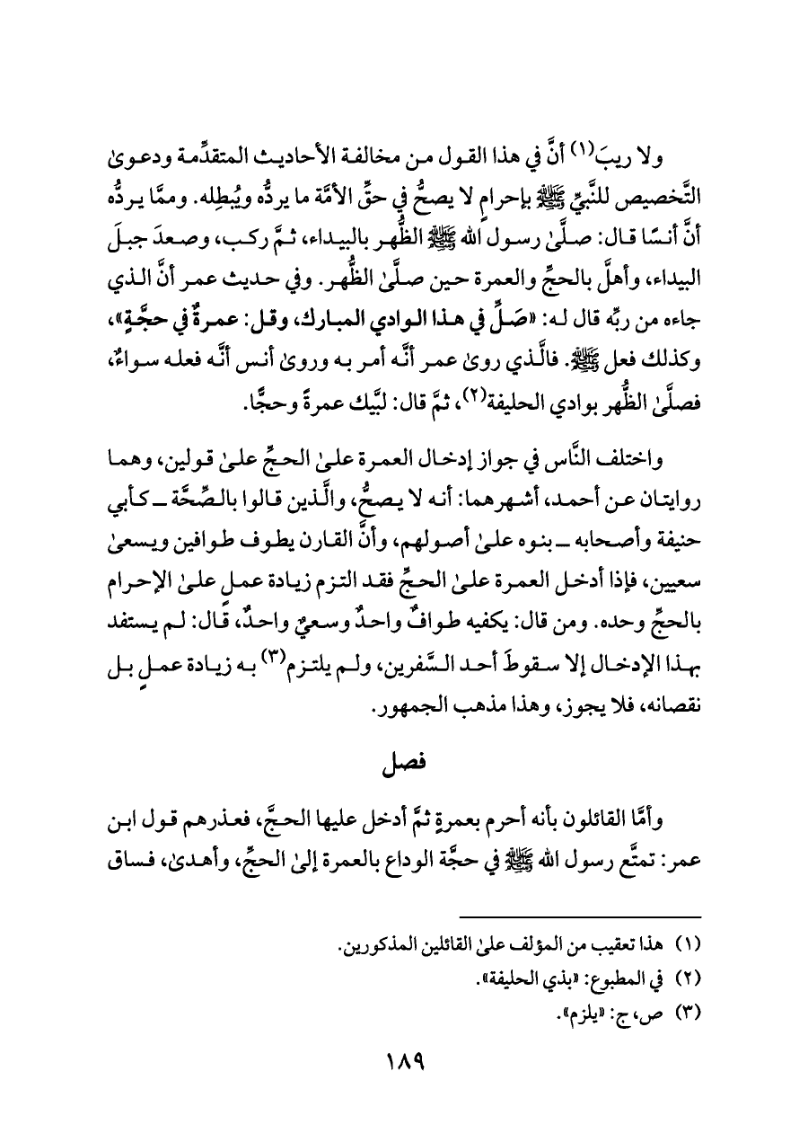 ولا ريبَ (¬١) أنَّ في هذا القول من مخالفة الأحاديث المتقدِّمة ودعوى التَّخصيص للنَّبيِّ - صلى الله عليه وسلم - بإحرامٍ لا يصحُّ في حقِّ الأمَّة ما يردُّه ويُبطِله. وممَّا يردُّه أنَّ أنسًا قال: صلَّى رسول الله - صلى الله عليه وسلم - الظُّهر بالبيداء، ثمَّ ركب، وصعدَ جبلَ البيداء، وأهلَّ بالحجِّ والعمرة حين صلَّى الظُّهر. وفي حديث عمر أنَّ الذي جاءه من ربِّه قال له: «صَلِّ في هذا الوادي المبارك، وقل: عمرةٌ في حجَّةٍ»، وكذلك فعل - صلى الله عليه وسلم -. فالَّذي روى عمر أنَّه أمر به وروى أنس أنَّه فعله سواءٌ، فصلَّى الظُّهر بوادي الحليفة (¬٢)، ثمَّ قال: لبَّيك عمرةً وحجًّا.