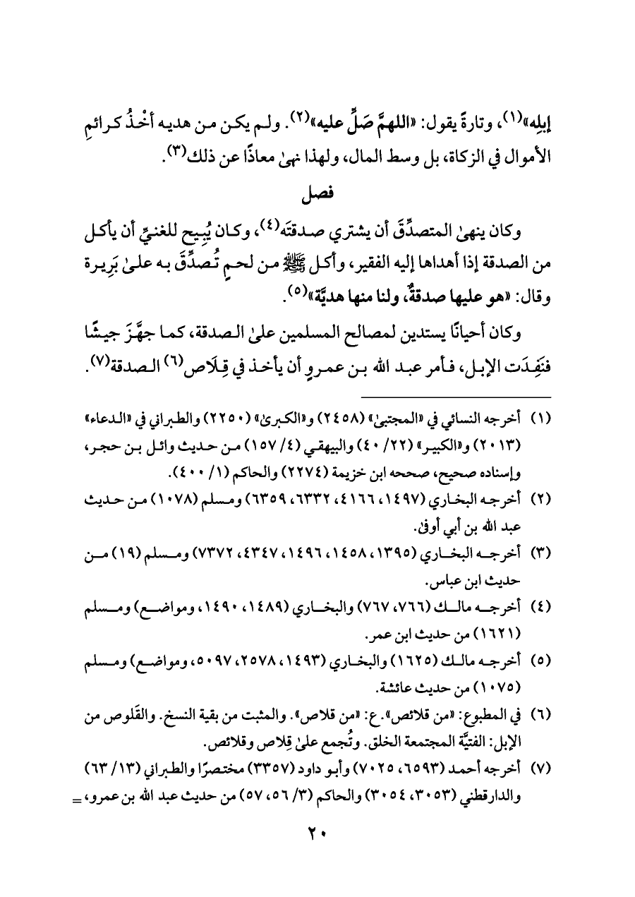 إبلِه» (¬١)، وتارةً يقول: «اللهمَّ صَلِّ عليه» (¬٢). ولم يكن من هديه أخْذُ كرائمِ الأموال في الزكاة، بل وسط المال، ولهذا نهى معاذًا عن ذلك (¬٣).
