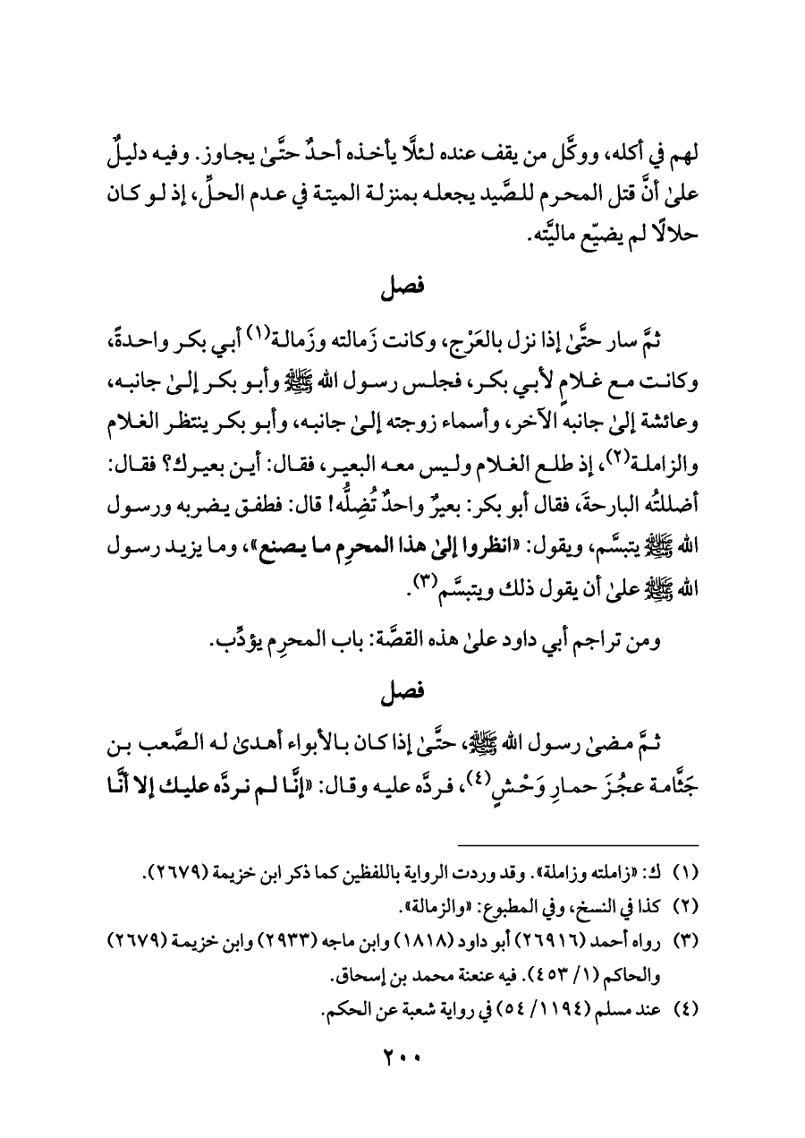 ثمَّ سار حتَّى إذا نزل بالعَرْج، وكانت زَمالته وزَمالة (¬١) أبي بكر واحدةً، وكانت مع غلامٍ لأبي بكر، فجلس رسول الله - صلى الله عليه وسلم - وأبو بكر إلى جانبه، وعائشة إلى جانبه الآخر، وأسماء زوجته إلى جانبه، وأبو بكر ينتظر الغلام والزاملة (¬٢)، إذ طلع الغلام وليس معه البعير، فقال: أين بعيرك؟ فقال: أضللتُه البارحةَ، فقال أبو بكر: بعيرٌ واحدٌ تُضِلُّه! قال: فطفق يضربه ورسول الله - صلى الله عليه وسلم - يتبسَّم، ويقول: «انظروا إلى هذا المحرِم ما يصنع»، وما يزيد رسول الله - صلى الله عليه وسلم - على أن يقول ذلك ويتبسَّم (¬٣).