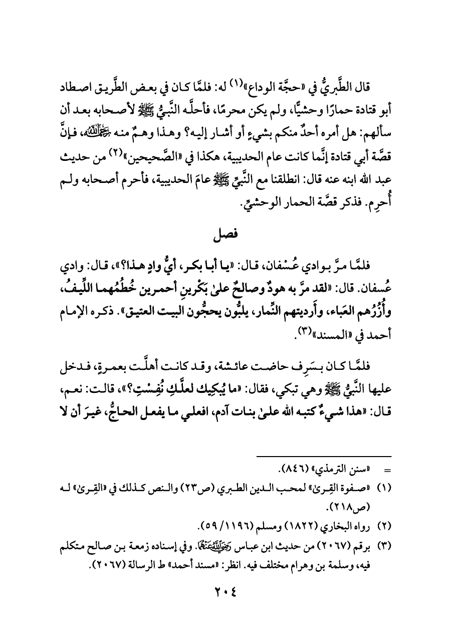فلمَّا مرَّ بوادي عُسْفان، قال: «يا أبا بكر، أيُّ وادٍ هذا؟»، قال: وادي عُسفان. قال: «لقد مرَّ به هودٌ وصالحٌ على بَكْرينِ أحمرين خُطُمُهما اللِّيفُ، وأُزُرُهم العَباء، وأَرديتهم النِّمار، يلبُّون يحجُّون البيت العتيق». ذكره الإمام أحمد في «المسند» (¬٣).