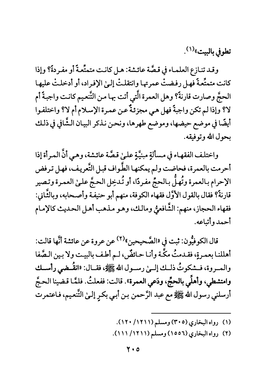 وقد تنازع العلماء في قصَّة عائشة: هل كانت متمتِّعةً أو مفردةً؟ وإذا كانت متمتِّعةً فهل رفضتْ عمرتها وانتقلتْ إلى الإفراد، أو أدخلتْ عليها الحجَّ وصارت قارنةً؟ وهل العمرة الَّتي أتت بها من التَّنعيم كانت واجبةً أم لا؟ وإذا لم تكن واجبةً فهل هي مجزئةٌ عن عمرة الإسلام أم لا؟ واختلفوا أيضًا في موضع حيضها، وموضع طهرها، ونحن نذكر البيان الشَّافي في ذلك بحول الله وتوفيقه.