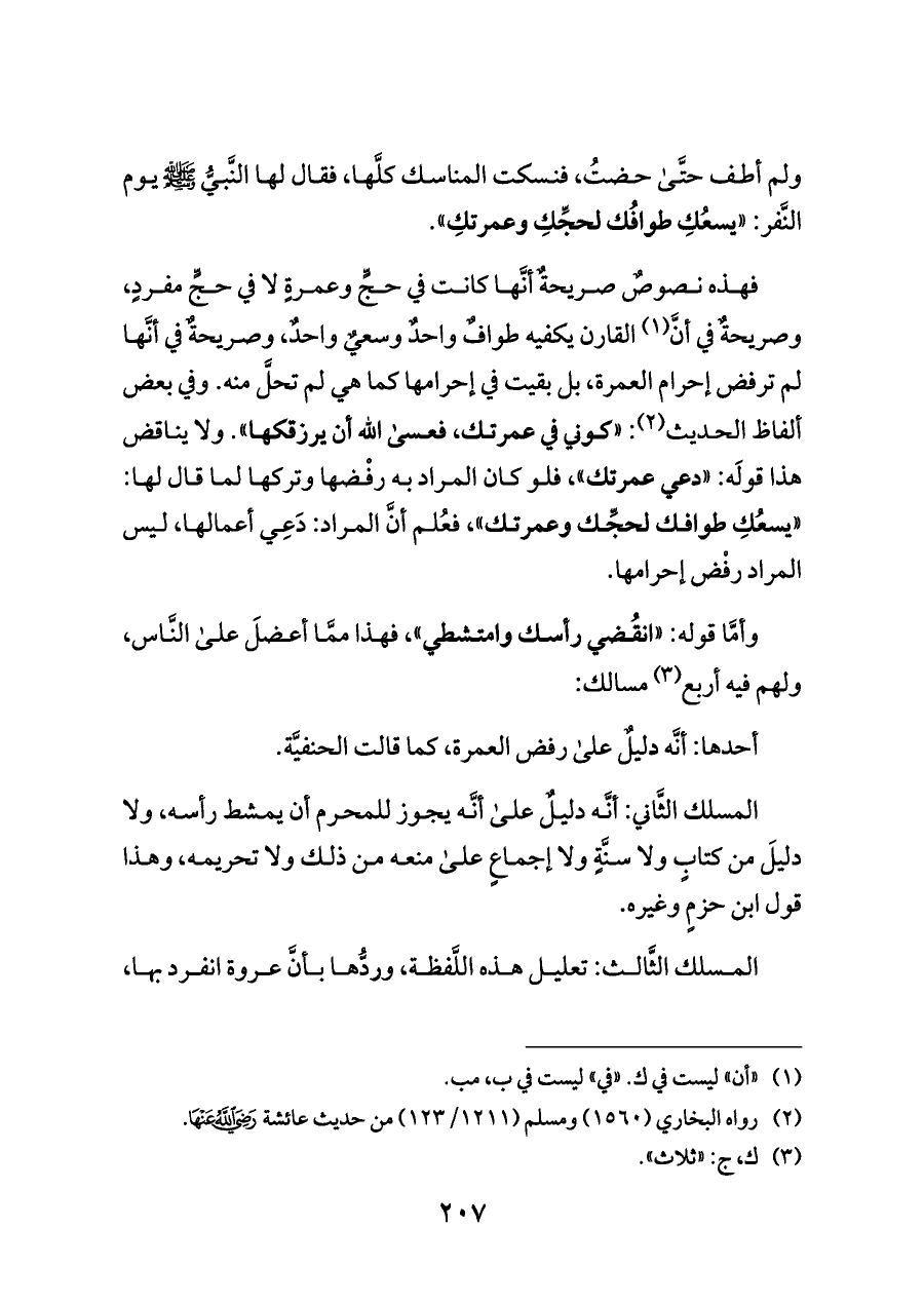فهذه نصوصٌ صريحةٌ أنَّها كانت في حجٍّ وعمرةٍ لا في حجٍّ مفردٍ، وصريحةٌ في أنَّ (¬١) القارن يكفيه طوافٌ واحدٌ وسعيٌ واحدٌ، وصريحةٌ في أنَّها لم ترفض إحرام العمرة، بل بقيت في إحرامها كما هي لم تحلَّ منه. وفي بعض ألفاظ الحديث (¬٢): «كوني في عمرتك، فعسى الله أن يرزقكها». ولا يناقض هذا قولَه: «دعي عمرتك»، فلو كان المراد به رفْضها وتركها لما قال لها: «يسعُكِ طوافك لحجِّك وعمرتك»، فعُلم أنَّ المراد: دَعِي أعمالها، ليس المراد رفْض إحرامها.