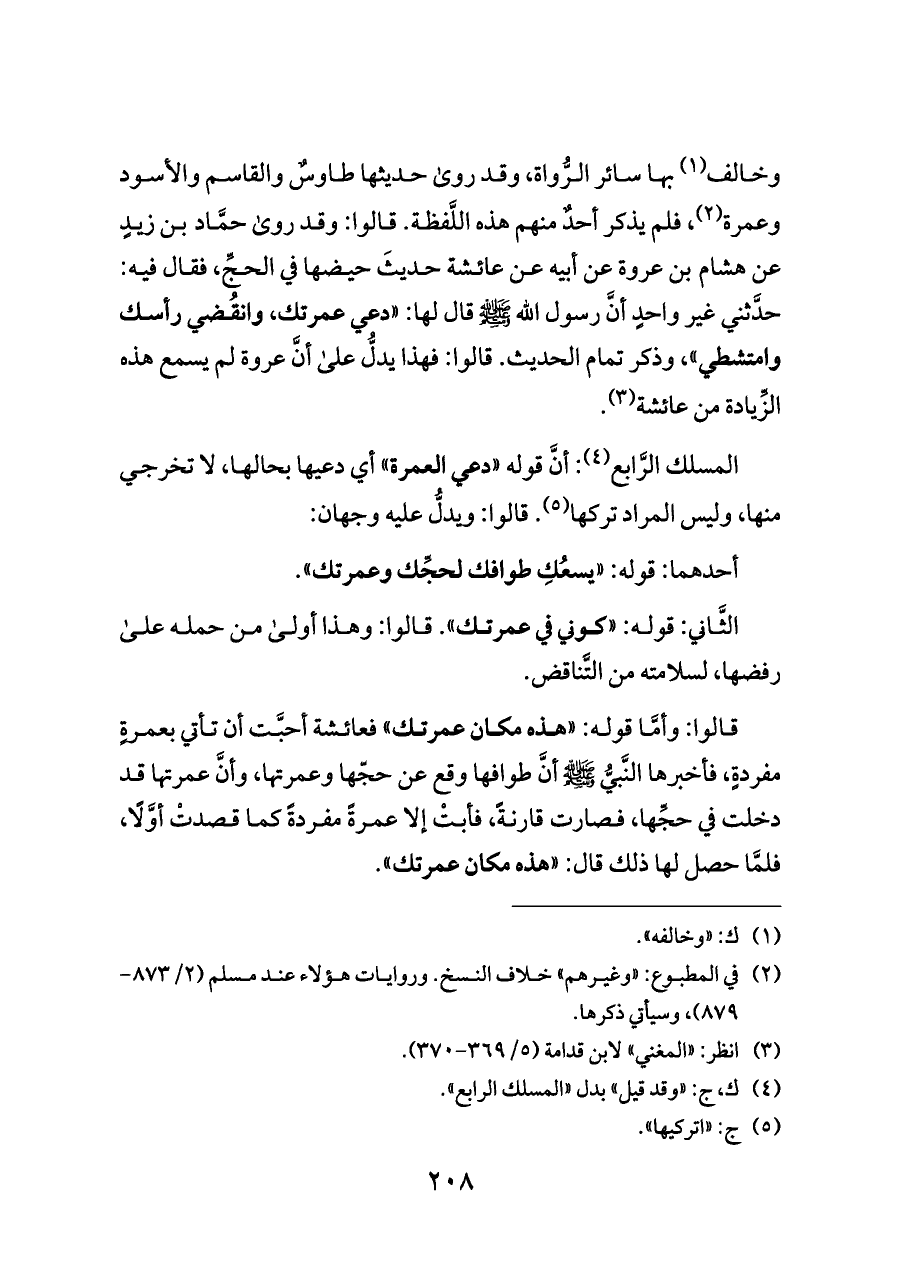 المسلك الرَّابع (¬٤): أنَّ قوله «دعي العمرة» أي دعيها بحالها، لا تخرجي منها، وليس المراد تركها (¬٥). قالوا: ويدلُّ عليه وجهان: