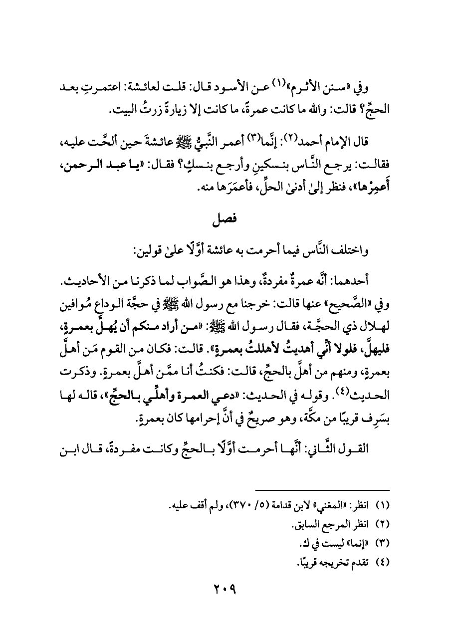 قال الإمام أحمد (¬٢): إنَّما (¬٣) أعمر النَّبيُّ - صلى الله عليه وسلم - عائشةَ حين ألحَّت عليه، فقالت: يرجع النَّاس بنسكينِ وأرجع بنسكٍ؟ فقال: «يا عبد الرحمن، أَعمِرْها»، فنظر إلى أدنى الحلِّ، فأعمَرَها منه.